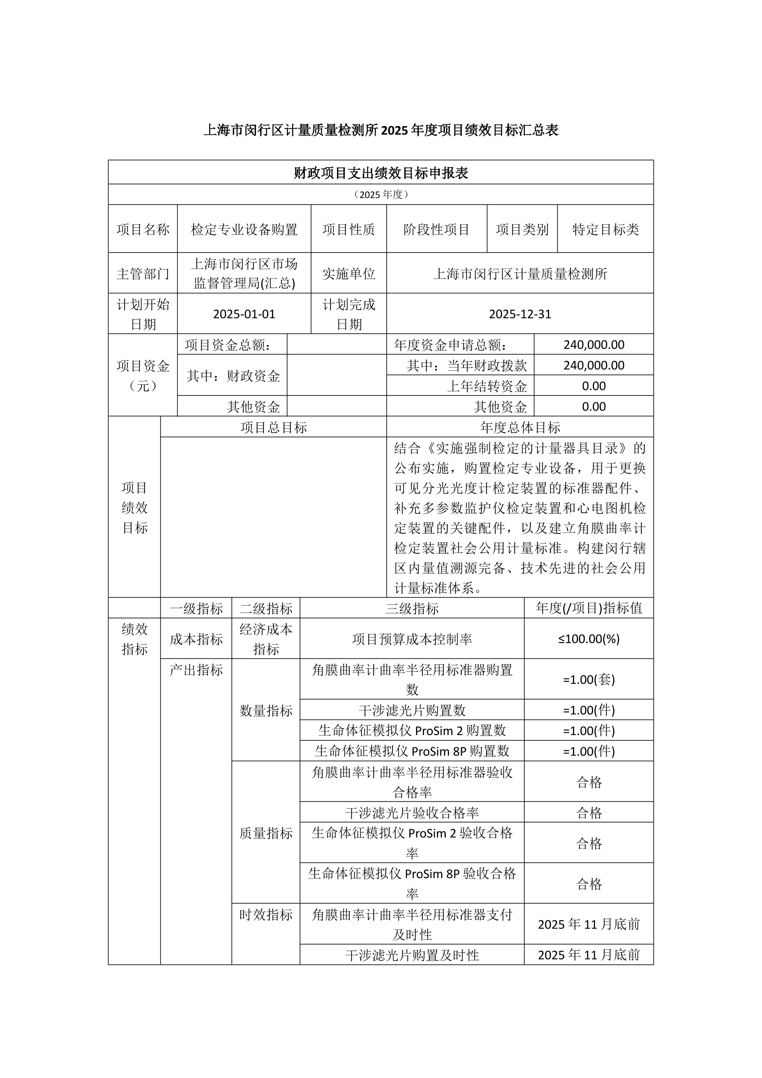 上海市闵行区计量质量检测所2025年度项目绩效目标汇总表