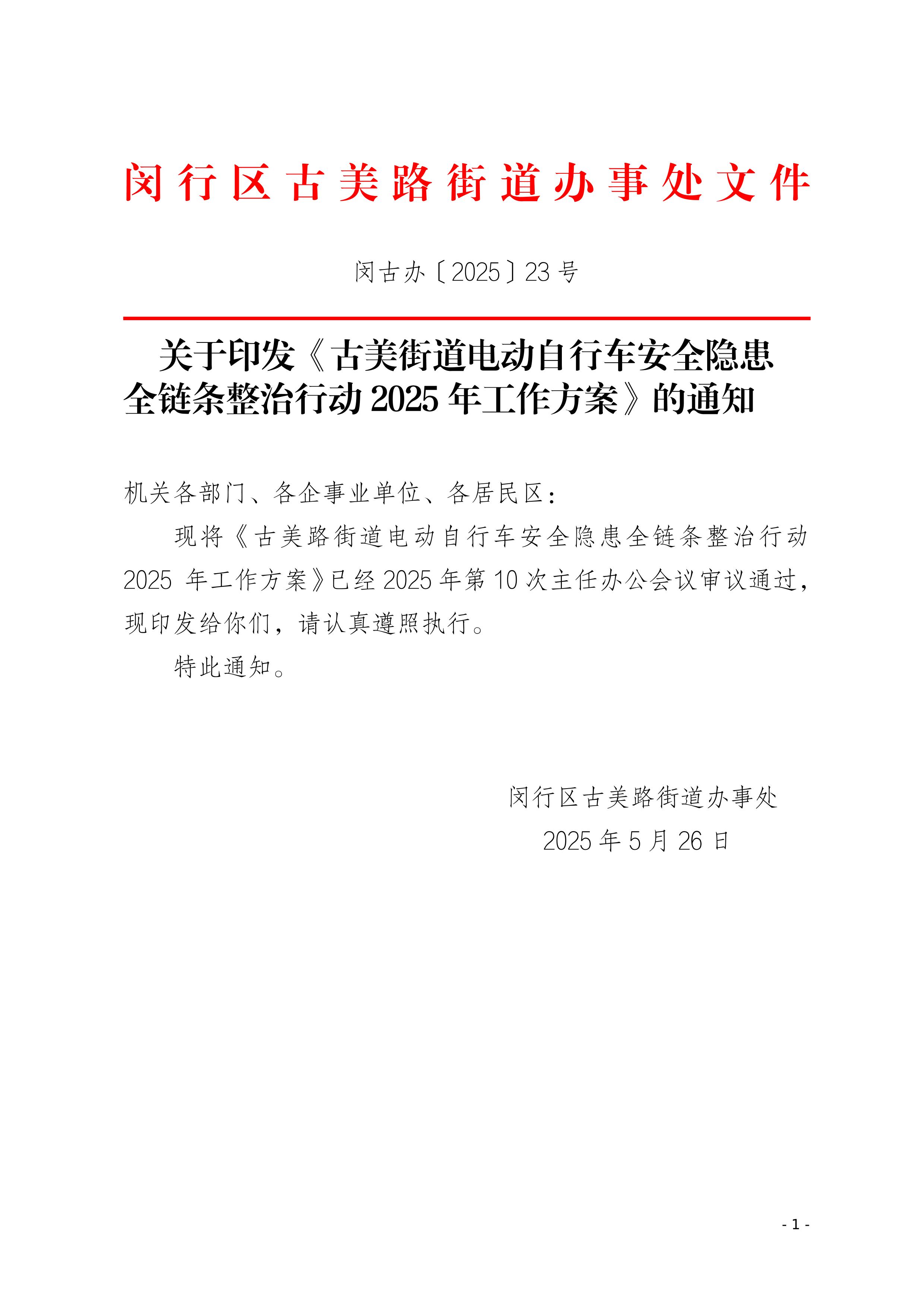 关于印发《古美街道电动自行车安全隐患全链条整治行动2025年工作方案》的通知
