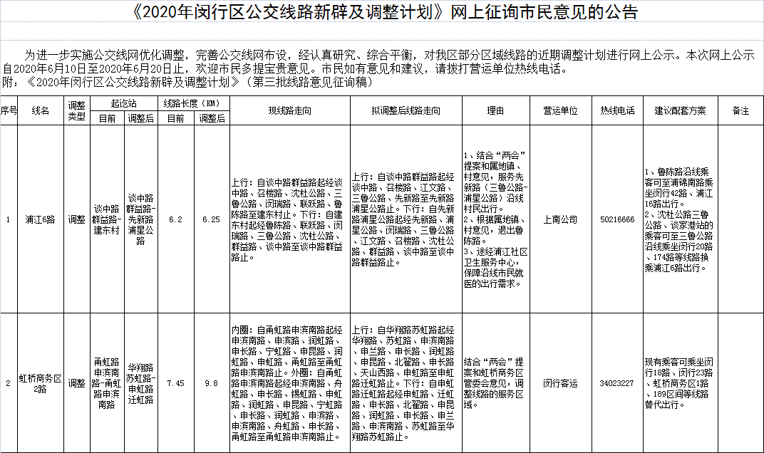《2020年闵行区公交线路新辟及调整计划》网上征询市民意见的公告(第三批线路意见征询稿)