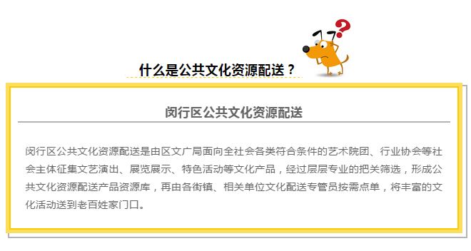 数百场活动来到家门口 值得一提的是,这651场配送活动中,有超过60%的活动都将配送至居村文化活动室、文化客堂间、邻里中心等四级文化空间,切实来到百姓家门口! 2018年,通过专家评审组严格的“二阶评审”程序,共有131家社会主体、485项文化产品入选今年度的《闵行区公共文化配送产品资源库》 通过在“闵行文化云”平台建设的过程中增加“文化配送”板块,借助平台的信息化功能,扩大闵行区公共文化资源配送的覆盖力和影响力。