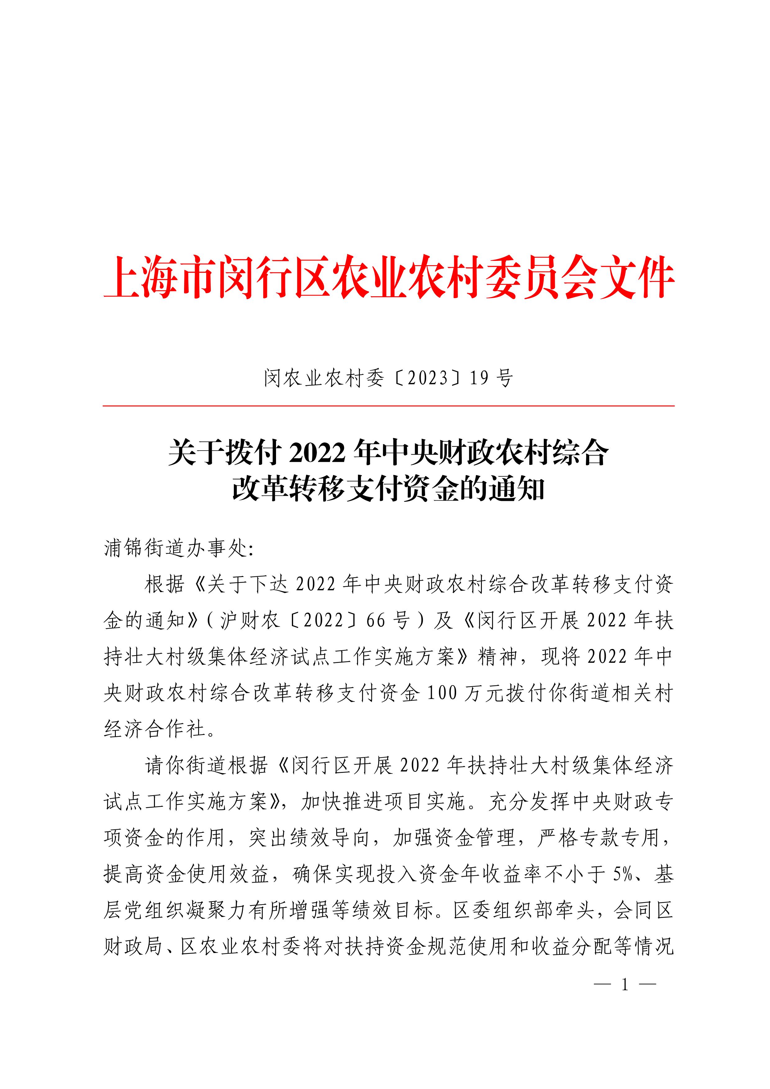 浦锦街道办事处: 根据《关于下达2022年中央财政农村综合改革转移支付资金的通知》(沪财农〔2022〕66号)及《闵行区开展2022年扶持壮大村级集体经济试点工作实施方案》精神,现将2022年中央财政农村综合改革转移支付资金100万元拨付你街道相关村经济合作社。 请你街道根据《闵行区开展2022年扶持壮大村级集体经济试点工作实施方案》,加快推进项目实施。充分发挥中央财政专项资金的作用,突出绩效导向,加强资金管理,严格专款专用,提高资金使用效益,确保实现投入资金年收益率不小于5%、基层党组织凝聚力有所增强等绩效目标。区委组织部牵头,会同区财政局、区农业农村委将对扶持资金规范使用和收益分配等情况进行监督检查。