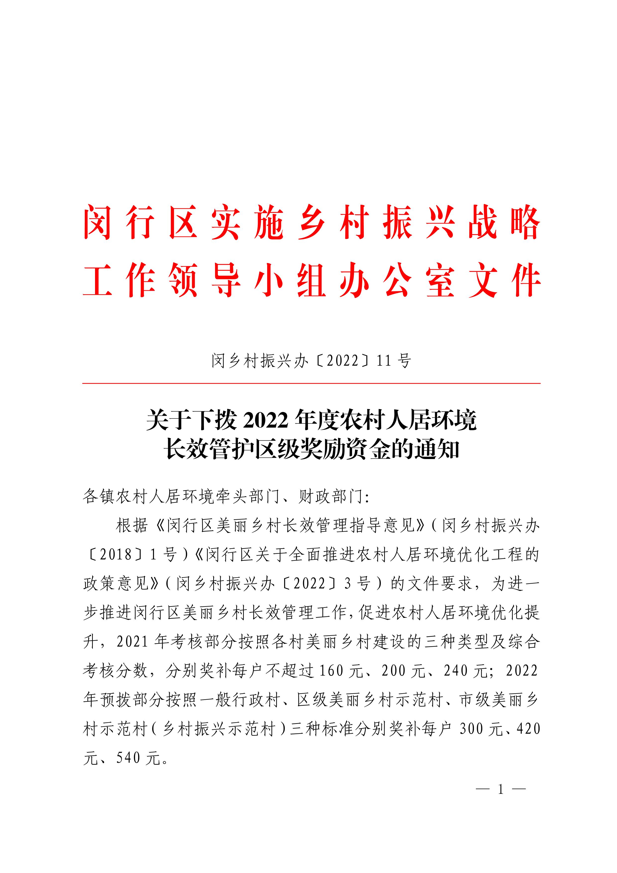 各镇农村人居环境牵头部门、财政部门: 根据《闵行区美丽乡村长效管理指导意见》(闵乡村振兴办〔2018〕1号)《闵行区关于全面推进农村人居环境优化工程的政策意见》(闵乡村振兴办〔2022〕3号)的文件要求,为进一步推进闵行区美丽乡村长效管理工作,促进农村人居环境优化提升,2021年考核部分按照各村美丽乡村建设的三种类型及综合考核分数,分别奖补每户不超过160元、200元、240元;2022年预拨部分按照一般行政村、区级美丽乡村示范村、市级美丽乡村示范村(乡村振兴示范村)三种标准分别奖补每户300元、420元、540元。 现将2021年考核部分及2022年预拨部分的区级奖励资金明细发给你们,请你单位按照《闵行区农村人居环境长效管护奖励资金管理办法》(闵农业农村委〔2022〕33号)相关要求,对2022年预拨部分的资金按照不低于1:1比例进行镇级资金配套,严格遵守相关财经纪律及要求,加强监督管理,形成完备档案资料,确保资金专款专用,严格按照文件拨付资金,切实提高资金使用效益。 特此通知。