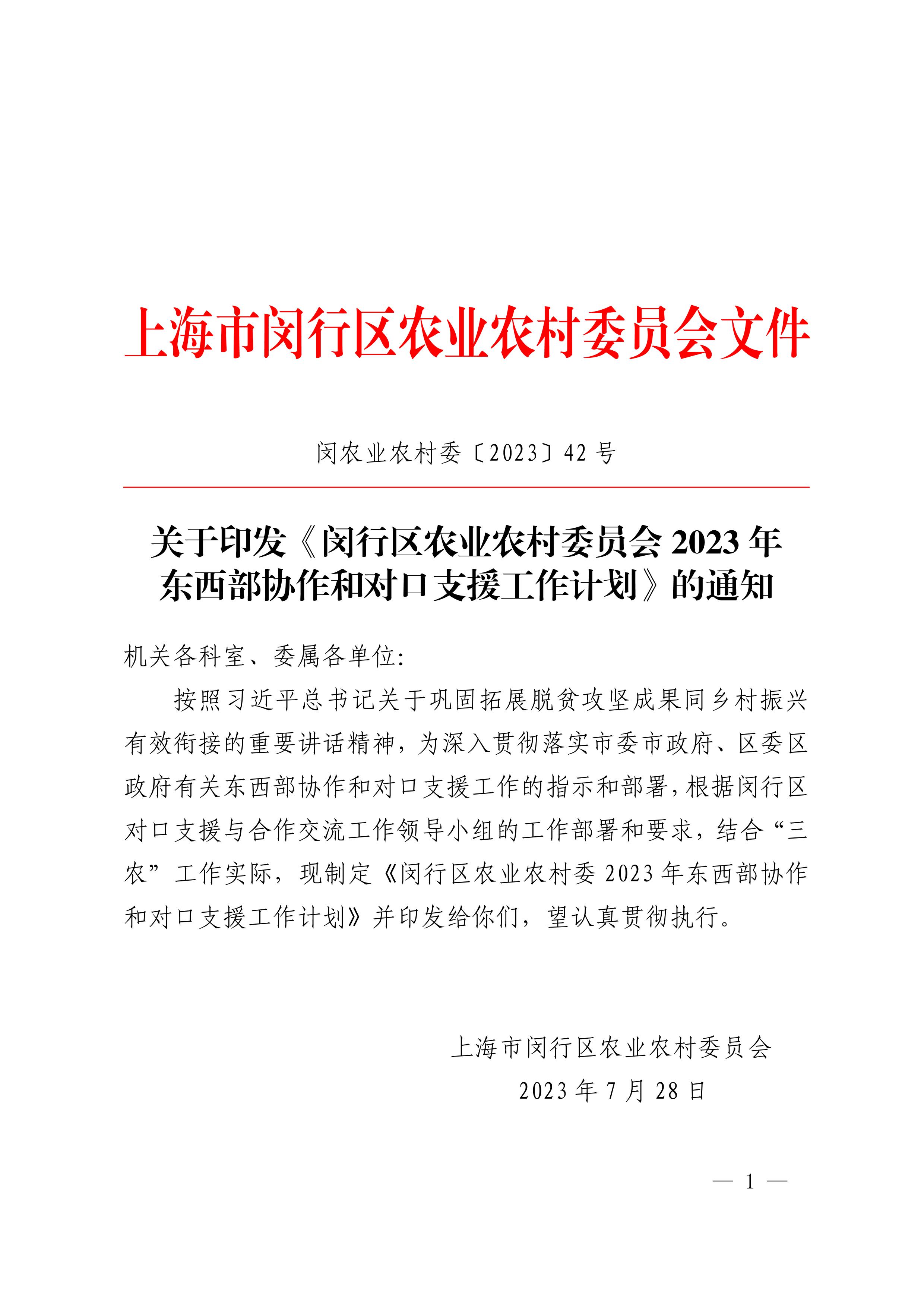 关于印发《闵行区农业农村委员会2023年东西部协作和对口支援工作计划》的通知