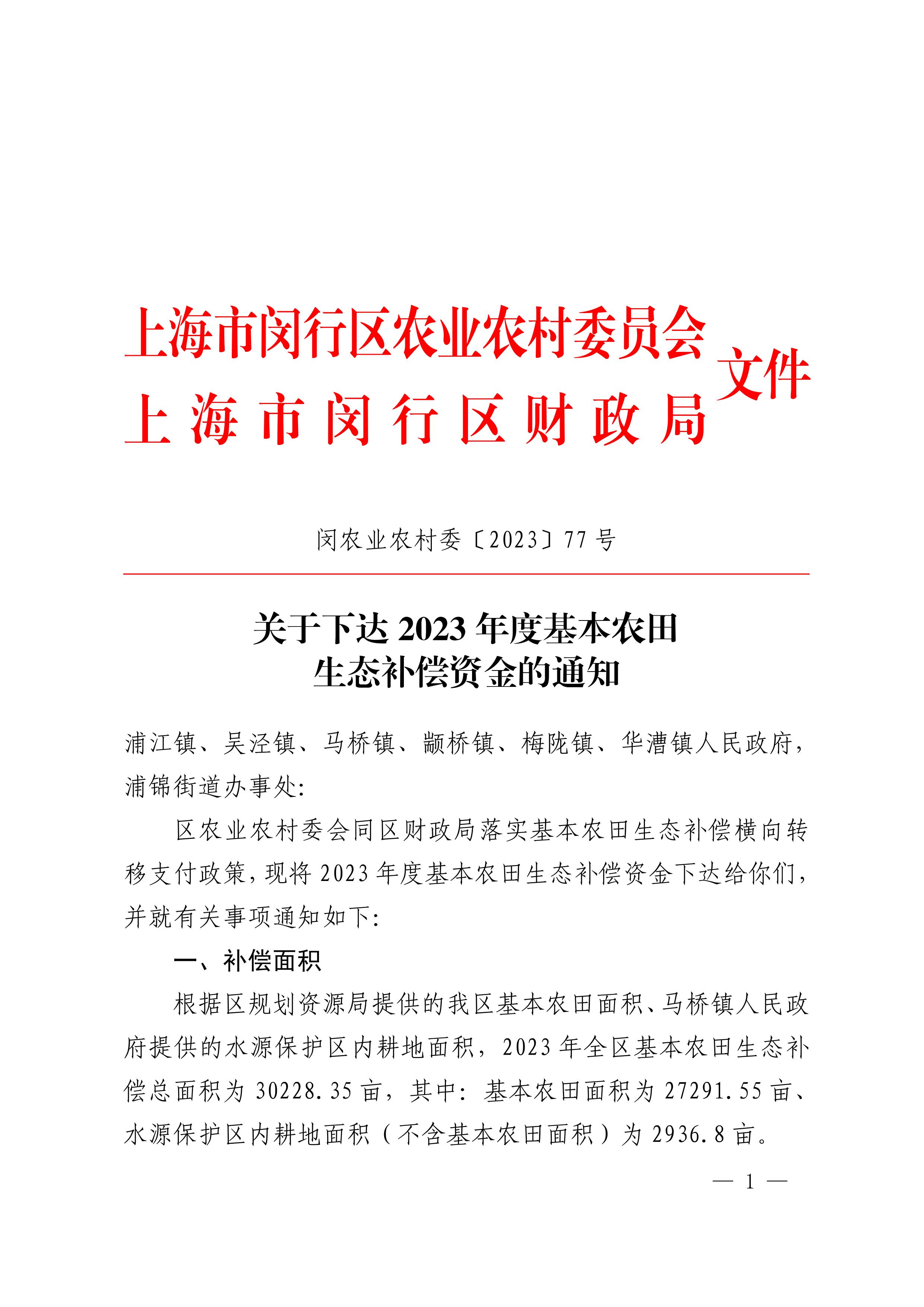 浦江镇、吴泾镇、马桥镇、颛桥镇、梅陇镇、华漕镇人民政府,浦锦街道办事处: 区农业农村委会同区财政局落实基本农田生态补偿横向转移支付政策,现将2023年度基本农田生态补偿资金下达给你们,并就有关事项通知如下: 一、补偿面积 根据区规划资源局提供的我区基本农田面积、马桥镇人民政府提供的水源保护区内耕地面积,2023年全区基本农田生态补偿总面积为30228.35亩,其中:基本农田面积为27291.55亩、水源保护区内耕地面积(不含基本农田面积)为2936.8亩。 二、补偿标准和金额 2023年基本农田生态补偿标准为2500元/亩/年,全区2023年基本农田生态补偿资金总额为7557.0875万元(各街镇补偿面积及资金分配情况详见附件)。 三、工作要求 (一)相关街镇应以年度补偿标准和有关村基本农田及水源保护区内耕地面积为基数,对各村分配补偿资金。 (二)相关街镇应以村为单位,对各村分配补偿资金情况进行公示,公示时间不少于7天。公示内容包括补偿项目名称(“闵行区基本农田生态补偿费”)、补偿对象、补偿标准、补偿面积、补偿金额等要素。 (三)相关村要严格按照《关于落实闵行区农业高质量发展和农村集体经济发展扶持政策的通知》(闵农业农村委规〔2022〕1号)规定的资金用途,制定年度补偿资金使用计划,经村民代表大会同意,报街镇农经部门备案后实施。 (四)安排对农民实施奖补的村,应对奖补资金发放明细进行公示。公示内容包括补偿项目名称(“闵行区基本农田生态补偿费”)、补偿对象、补偿金额等要素,公示时间不少于7天。对农民的奖补资金不得超过文件规定的生态补偿主要用途资金。 (五)相关村对农民的奖补资金要专项发放,名称为“闵行区基本农田生态补偿费”,确需与其他资金同时发放的,应单独列示。奖补资金不得以物化、福利形式发放。 (六)相关村补偿资金的使用实行专款专用和单独核算,不得截留、挤占、挪用或改变资金用途。相关村收到补偿资金后,应在“补助收入”科目下设置“闵行区基本农田生态补偿收入”明细科目,专项核算生态补偿资金的收入情况;使用补偿资金时,按用途,分别在相关科目下设置“闵行区基本农田生态补偿支出”明细科目进行核算。 (七)相关街镇要加强政策宣传,确保相关村知晓补偿资金使用和管理要求。街镇财政、农经、农业农村等部门应对村补偿资金使用和管理情况进行全面监督检查,及时发现和纠正问题。区农业农村委、区财政局等部门将对相关街镇、村补偿资金发放和使用情况进行抽查。抽查结果不合格的村,在一个月内进行整改。整改后仍不合格的,停发下一年度该村补偿资金。对存在严重违规行为的,依照有关法律、法规追究有关责任人的责任。