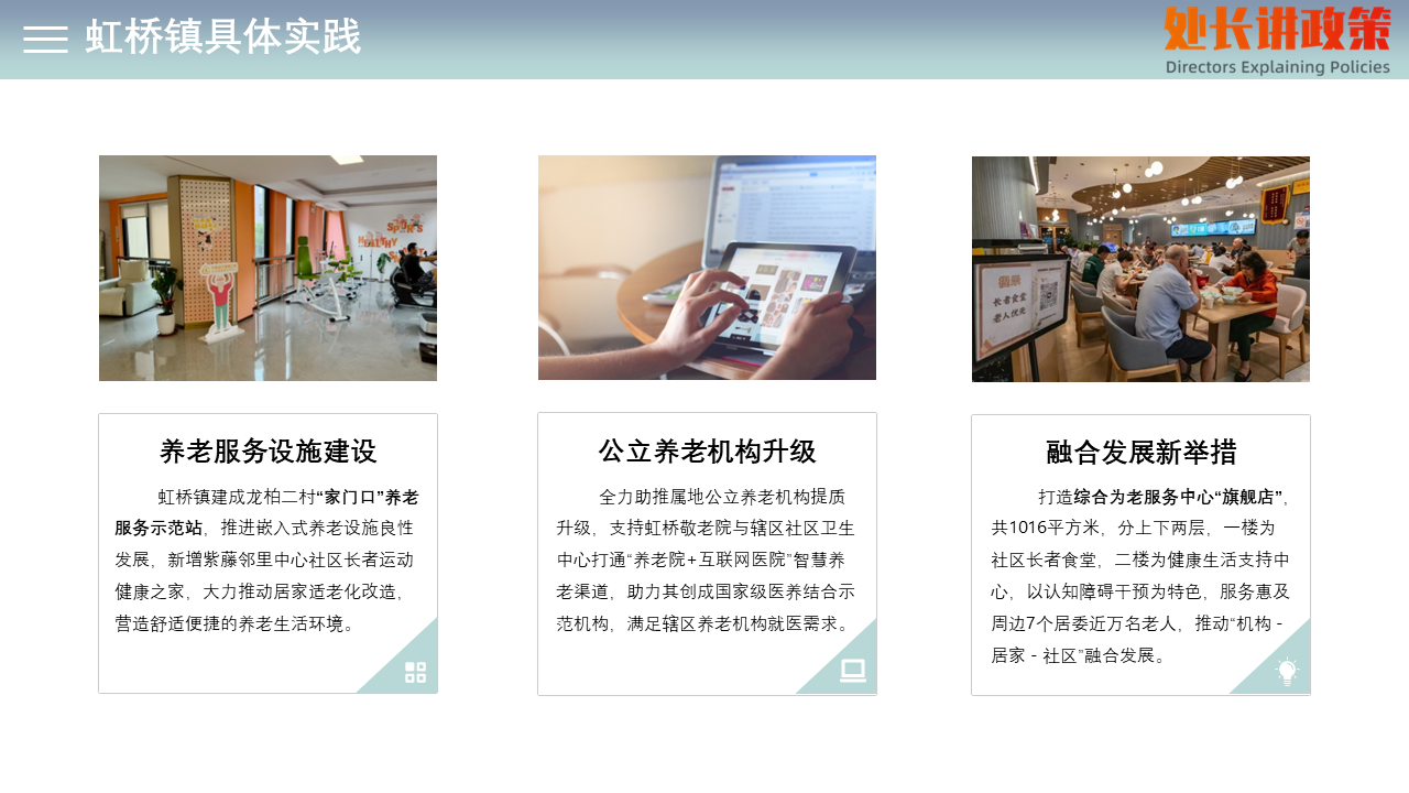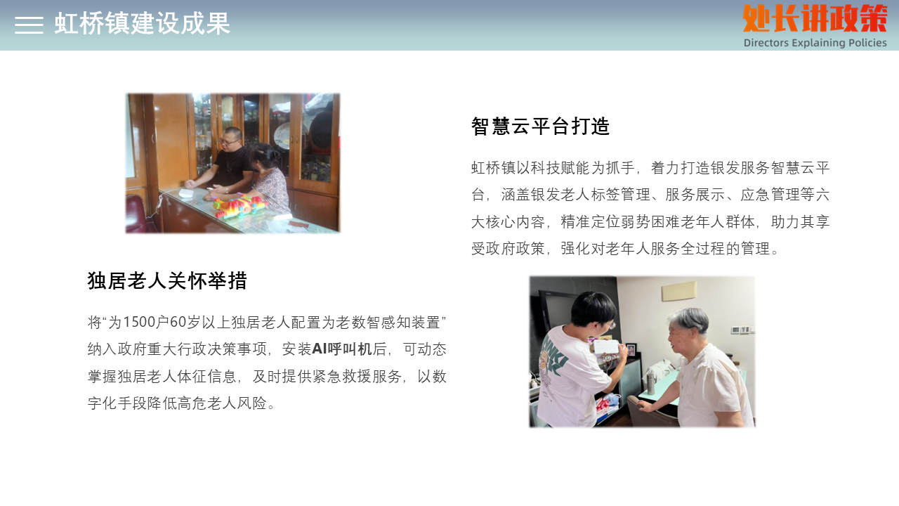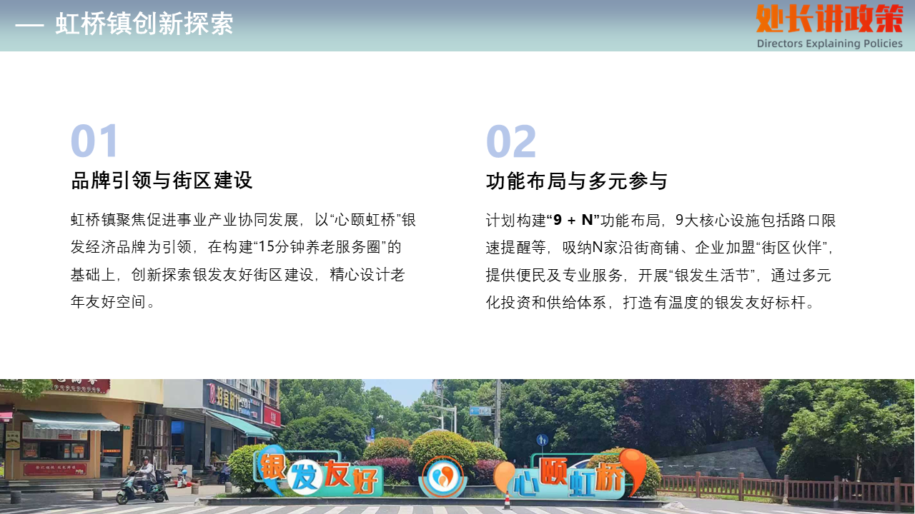 8月15日上午,虹桥镇举办“共建银发经济·共创美好生活”政府开放月活动,虹桥镇副镇长常江化身讲解员,详细解读银发经济若干政策措施,并介绍虹桥镇养老事业总体情况。 习近平总书记提出,要大力发展银发经济。自2024年起,《国务院办公厅关于发展银发经济增进老年人福祉的意见》《上海市推动银发经济高质量发展若干政策措施》等一系列政策文件相继出台,从中央到地方逐渐形成支持政策体系,对如何推动银发经济发展作出系统谋划和具体部署。 为更好把握全球和国内银发经济发展的大势,推动虹桥镇银发经济高质量发展,近年来,虹桥镇紧扣民生需求,推动一批民心实事工程落地见效,构建“居家社区机构相协调、医养康养相融合”的养老服务体系,全力打造“心颐虹桥”银发经济品牌,促进老龄事业与银发经济协调互促发展。 一、构建“家门口”养老保障网络 推动银发经济高质量发展是一项复杂的系统工程,首先要加强保障银发经济发展的养老服务设施,相关政策要求“到2029年,养老服务网络基本建成,服务能力和水平显著增强,扩容提质增效取得明显进展,基本养老服务供给不断优化”,明确“新建居住区按照人均用地不少于0.1平方米的标准分区分级规划设置社区养老服务设施”。上海市要求“积极发展老年宜居产业,支持各区结合社区嵌入式服务设施建设,因地制宜打造一批适老化改造样板间。”为进一步加大对银发经济的保障支持力度,虹桥镇建成龙柏二村“家门口”养老服务示范站,打造了综合为老服务中心“旗舰店”——红松东路为老服务中心。 二、探索“定制化”服务供给形式 针对新形势下银发经济发展趋势和现代化条件下的老年人需求,相关政策提出“扩大老年助餐服务,引导外卖平台、物流企业等经营主体参与老年助餐配送”“建立健全社会化餐饮企业参与老年助餐机制,优化配送服务,丰富老年人选择”。虹桥镇积极探索实践“助餐+”服务,创新“助餐+公益”模式,设立“美好食光,随手公益”基金池,为辖区养老服务项目及孤老、特困老人等特殊群体提供资金援助。 三、打造“数字化”智慧养老场景 相关政策对智慧健康养老、数字适老化等进行部署,提出“打造智慧健康养老新业态,完善智慧健康养老产品及服务推广目录,推进新一代信息技术以及移动终端、可穿戴设备、服务机器人等智能设备在居家、社区、机构等养老场景集成应用。”上海市《政策措施》提出“拓展智慧养老场景和产品。支持企业围绕老年人需求和使用习惯,开发生活辅助、健康服务、康复辅助、安全监护、照护服务、情感慰藉等智慧养老产品,符合条件的纳入养老科技专项支持范围。” 虹桥镇以科技赋能为抓手,着力打造银发服务智慧云平台,为1500户60岁以上独居老人配置为老数智感知装置,以“人防+技防”的数字化手段将高危老人的风险降低。 四、促进老龄事业与银发经济协同发展 今年,虹桥镇聚焦促进事业产业协同发展,以“心颐虹桥”银发经济品牌为引领,在构建“15分钟养老服务圈”的基础上,创新探索银发友好街区建设,精心设计集服务、体验、互动于一体的老年友好空间,让街区成为有温度的银发友好标杆。 |