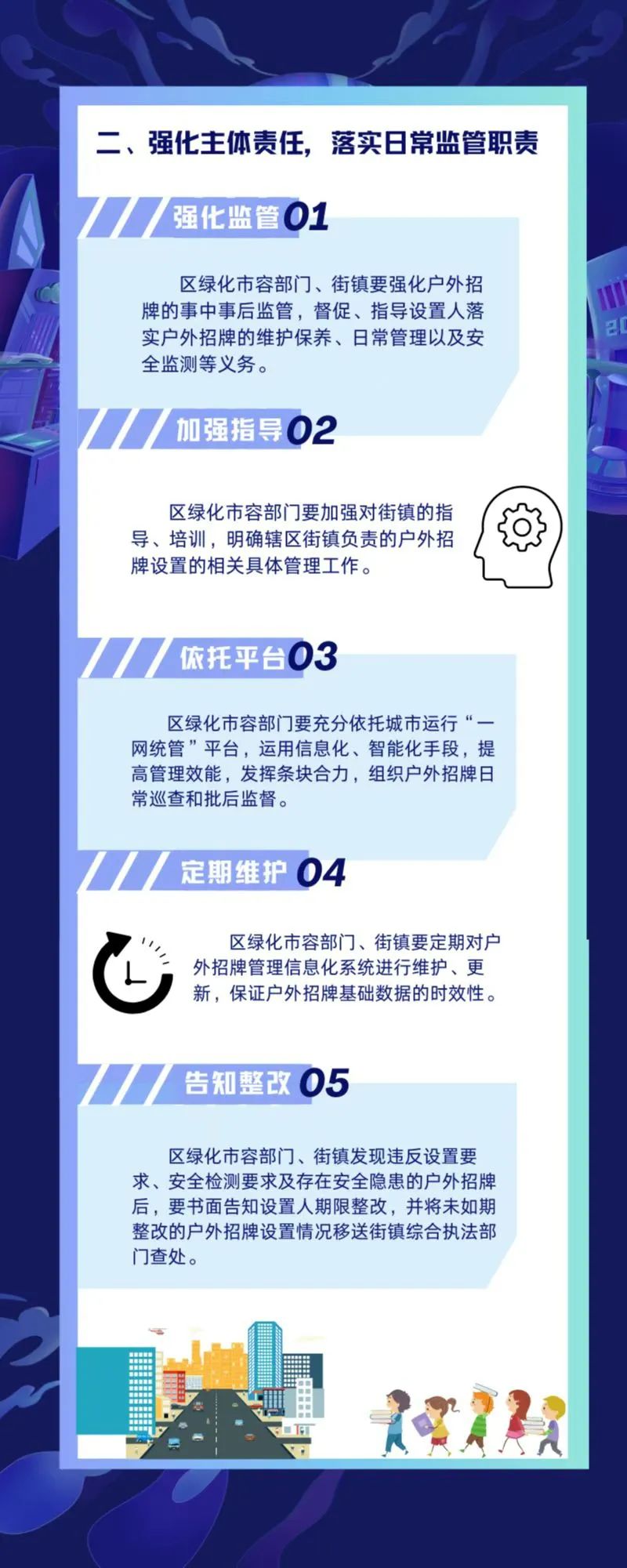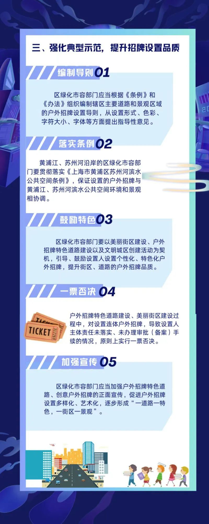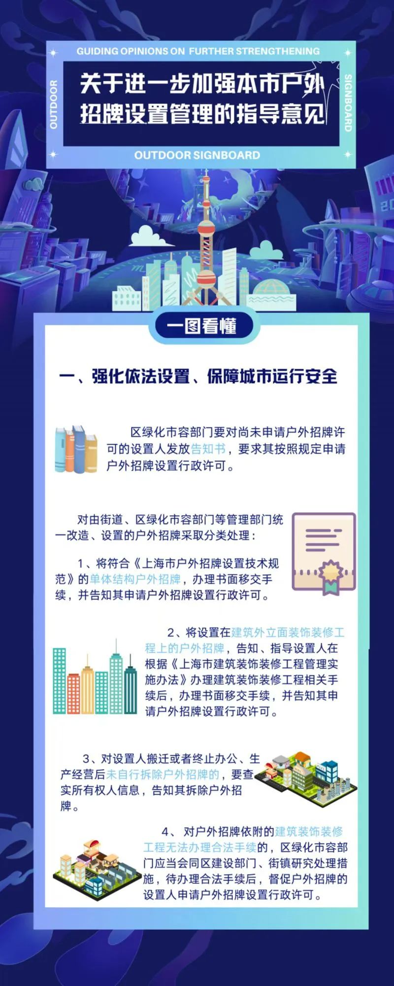 为进一步加强户外招牌设置管理,提高户外招牌精细化管理水平,营造整洁、有序、安全、美观的市容环境,根据《上海市市容环境卫生管理条例》《上海市户外招牌设置管理办法》等法规、规章规定,市绿化市容局出台了《上海市绿化和市容管理局关于进一步加强本市户外招牌设置管理的指导意见》(沪绿容〔2022〕189号),进一步加强本市户外招牌规范设置。