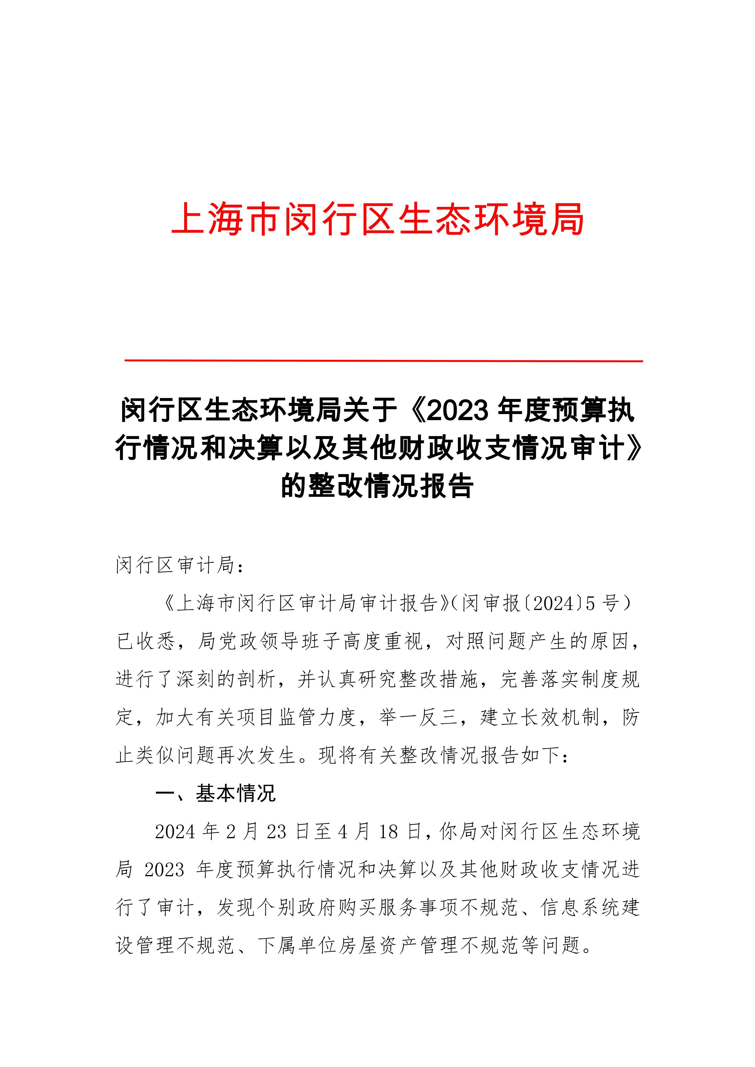 闵行区生态环境局关于《2023年度预算执行情况和决算以及其他财政收支情况审计》的整改情况报告.pdf