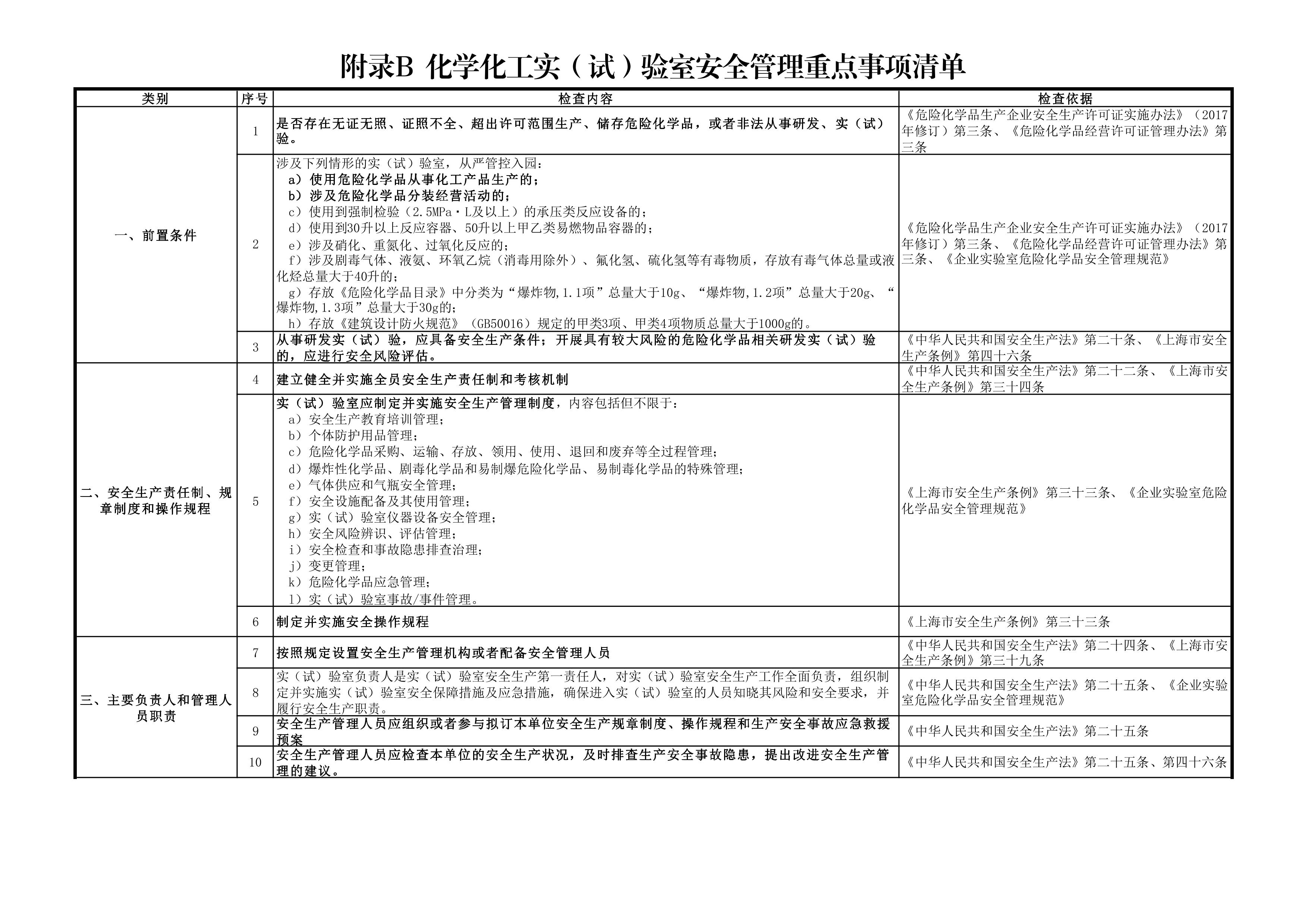 A.1 化学化工实(试)验室 指涉及使用危险化学品开展科学研究、技术研发、检测检验等活动的各类实(试)验场所,特指以租赁建筑物中的部分区域作为实(试)验场所的实(试)验室。 A.2 园区 指产权相对集中,有专门的运营管理单位,土地使用性质为工业,建筑物为工业建筑,有一幢以上专门用于出租的建筑物的相对独立的区域。 A.3 园区管理单位 指园区房屋产权所有人或承租人,同时承担园区物业管理服务的企业。 A.4 小试 在实验室探试基础上,以完成产品的结构设计和概念设计为目的的科研试验活动。 A.5 中试 化学(化工)新产品、新工艺、新技术在实验室研究成功后、规模化量产前,为验证工艺的可行性、稳定性和安全性,探索解决工业化生产关键技术而进行的工业技术开发和验证活动。 |