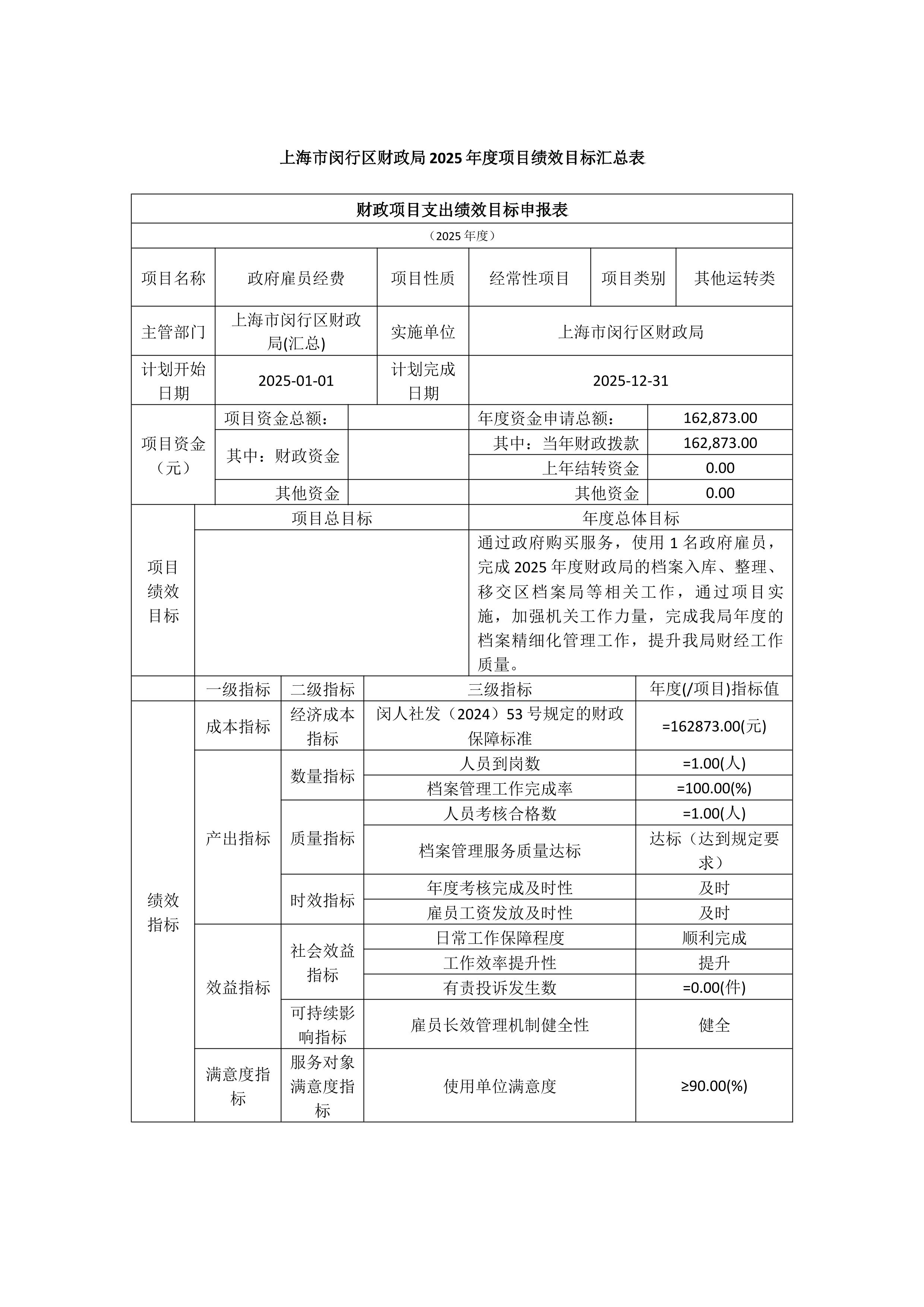 上海市闵行区财政局2025年度项目绩效目标汇总表