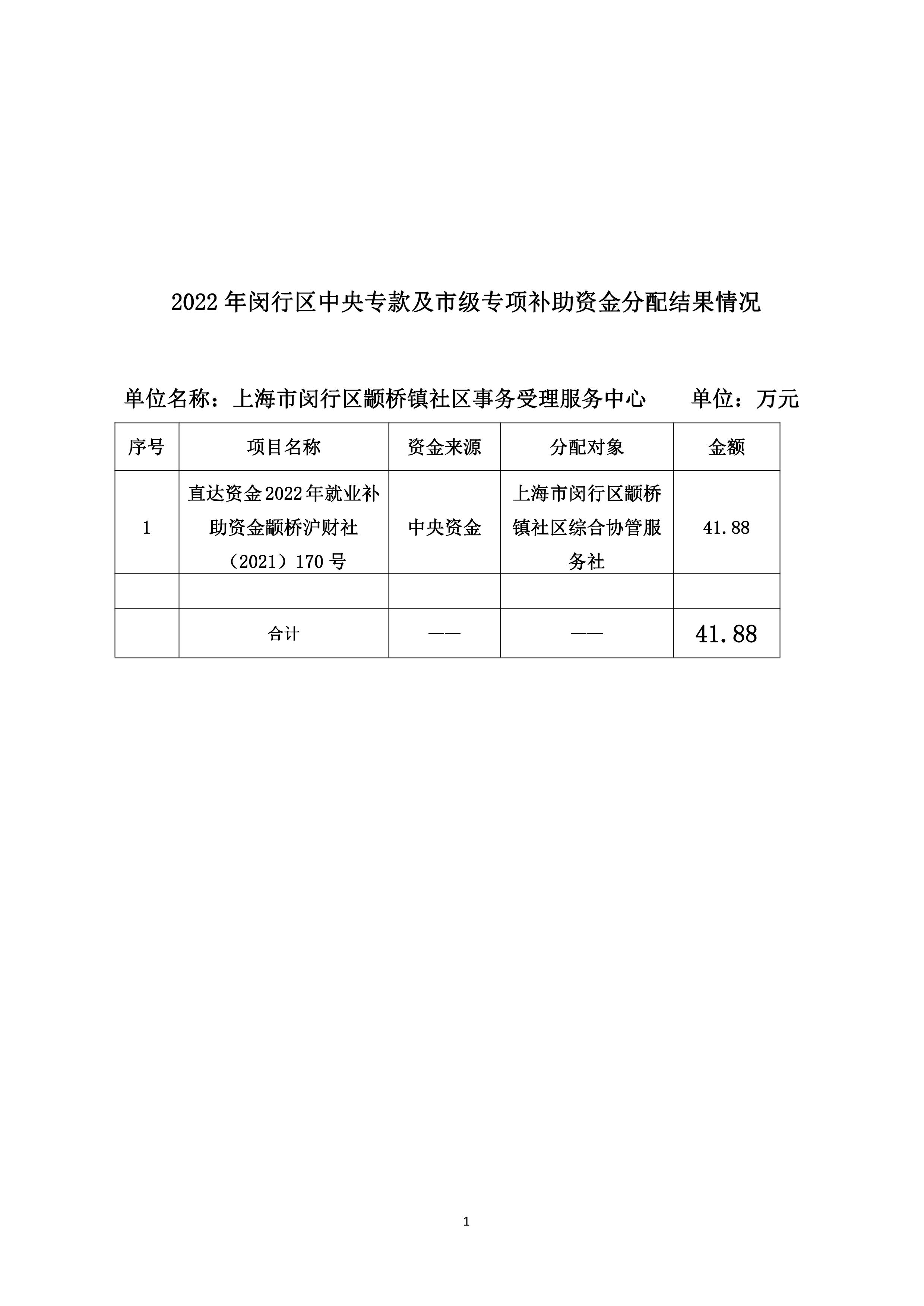 2022年闵行区中央专款及市级专项补助资金分配结果情况(受理中心)
