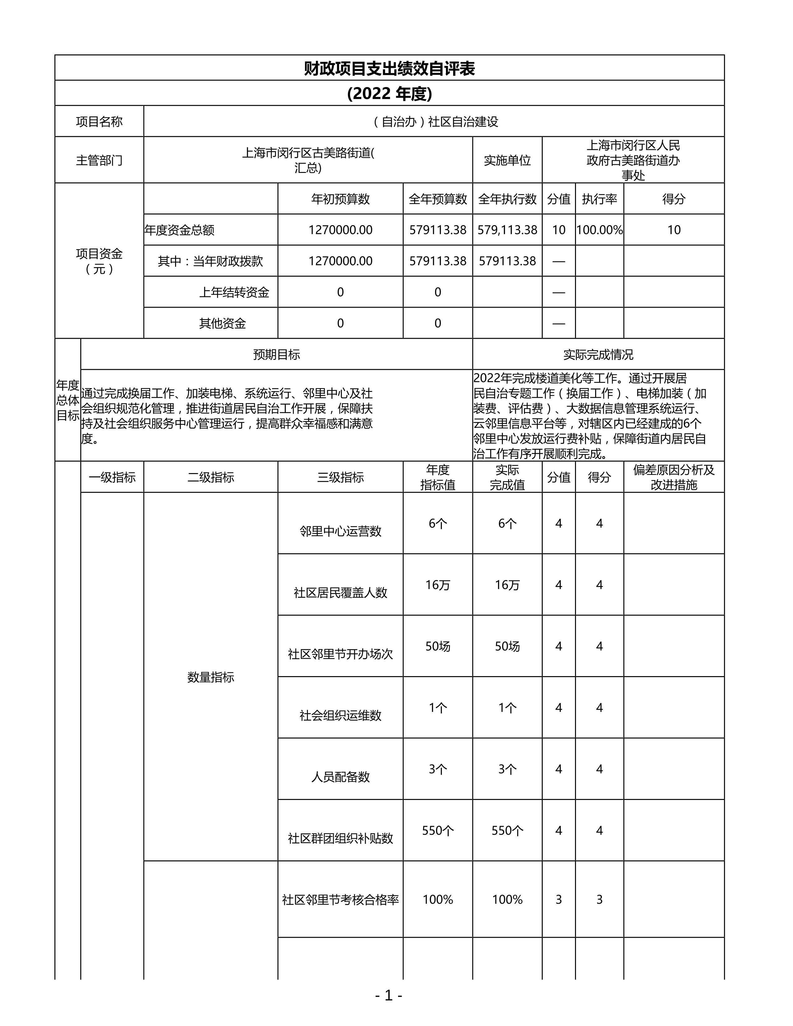 上海市闵行区古美路街道办事处本级2022年度项目绩效自评表