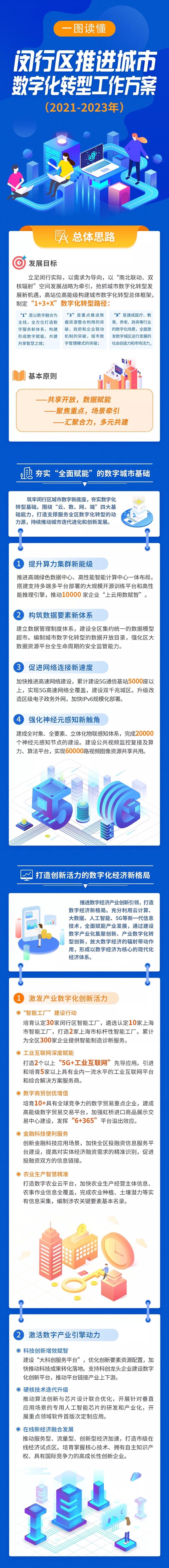 近日,闵行区委、区政府联合印发《闵行区推进城市数字化转型工作方案(2021-2023)》(闵委发〔2021〕52号),方案明确了闵行区将以需求为导向,以“南北联动、双核辐射”空间发展战略为牵引,推进城市数字化转型的总体思路,制定了“1+3+X”转型路径,确定了夯实全面赋能数字城市基础、打造创新活力数字化经济新格局、打造幸福美好数字化生活新图景、打造精细高效数字化治理新范式、推进特色地标建设等重点任务,强化了保障体系建设,旨在通过全面推进城市数字化转型将闵行打造成为区域高质量发展的强劲引擎。来一图读懂工作方案:
