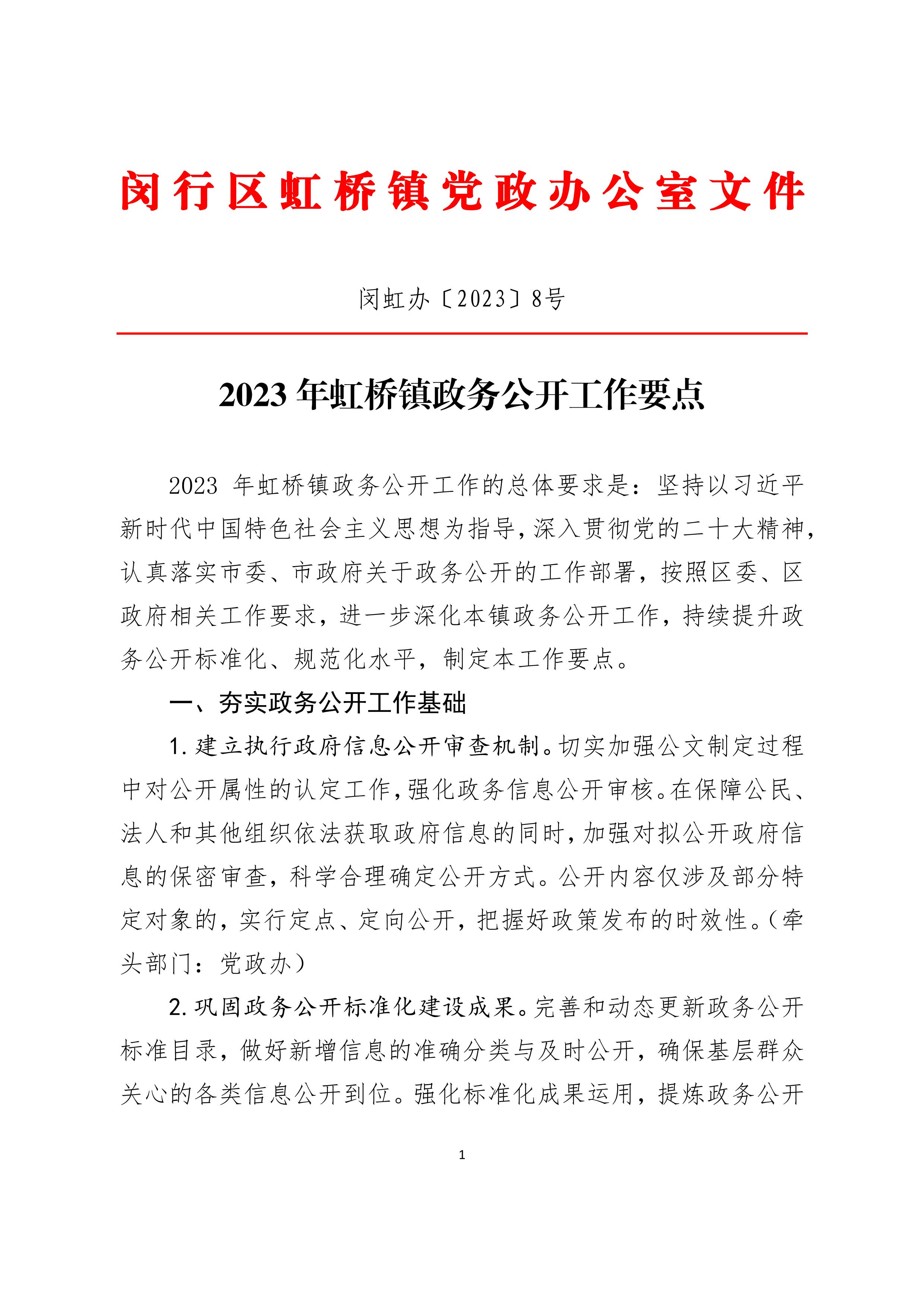 2023 年虹桥镇政务公开工作的总体要求是:坚持以习近平新时代中国特色社会主义思想为指导,深入贯彻党的二十大精神,认真落实市委、市政府关于政务公开的工作部署,按照区委、区政府相关工作要求,进一步深化本镇政务公开工作,持续提升政务公开标准化、规范化水平,制定本工作要点。 一、夯实政务公开工作基础 1.建立执行政府信息公开审查机制。切实加强公文制定过程中对公开属性的认定工作,强化政务信息公开审核。在保障公民、法人和其他组织依法获取政府信息的同时,加强对拟公开政府信息的保密审查,科学合理确定公开方式。公开内容仅涉及部分特定对象的,实行定点、定向公开,把握好政策发布的时效性。(牵头部门:党政办) 2.巩固政务公开标准化建设成果。完善和动态更新政务公开标准目录,做好新增信息的准确分类与及时公开,确保基层群众关心的各类信息公开到位。强化标准化成果运用,提炼政务公开工作成果应用及创新案例。(牵头部门:党政办) 3.规范政府网站和政务新媒体建设。严格落实网络意识形态责任制,强化政府网站、政务新媒体等集约化平台的安全防护和应急保障,做好日常巡查与维护。规范政府网站各公开栏目内容保障,理顺信息发布机制。落实信息公开专栏的及时维护及信息发布数量,及时向区档案馆定期移交政府信息,不断提高公文类信息的主动公开率。(责任部门:党政办、信息办、科信办) 4.提升依申请公开办理质效。进一步规范依申请公开办理流程,确保接收、办理、邮寄、办结归档等关键节点信息及时录入平台,全程留痕。配合做好政府信息公开行政复议、行政诉讼的报备。注重提高依申请办理服务能力和水平,注重办理过程中的沟通协调与疏导,强化与申请人沟通,提高答复的及时性和针对性。(牵头部门:党政办) 二、拓展各领域信息公开覆盖面 5.持续深化城市空间格局优化提升情况信息公开。加大重点设施建设、重大项目引进等信息公开力度。做好美丽街区、美丽家园、城市微更新等环境提升工程进展的信息公开。(责任部门:规建办、房管所、城管办、水务站) 6.扩大有效投资和优化营商环境政策举措信息公开。及时做好重大工程相关规划、政策文件及重大项目建设的信息公开。做好产业、行业扶持政策、引导资金、项目申报、成果奖励等内容公开。提升营商环境专栏信息覆盖面和集成度,推动惠企政策直达快享。完善市场监管规则和标准集中公开,持续推进反垄断和反不正当竞争执法信息公开,提高监管透明度。加强轻微违法行为依法不予行政处罚清单和市场主体以专用信用报告替代有无违法记录证明等制度措施的精准推介和适用性解读,大力推行“市场主体合规一码通”,为各类市场主体投资兴业创造更加公平的市场环境。(责任部门:经发办、企服中心、市场监督所、司法所) 7.碳达峰碳中和进展情况信息公开。做好建筑领域碳达峰实施方案、建筑节能减排专项扶持政策、海绵城市建设管理实施细则等方案的信息公开。深入做好污染防治信息公开力度,发布典型案例。(责任部门:经发办、规建办) 8.住房保障、改造和招生入学信息公开。加强廉租住房供应房源和申请信息的联动公开,做好申请辅导。做好既有多层住宅加装电梯、旧住房更新改造、电动自行车充电设施建设等工程项目的公示,加强宣传解释。继续做好义务教育招生政策、公办学校划片范围、民办学校招生计划等信息公开。(责任部门:规建办、社事办、房管所) 9.就业、养老、托育和民生保障待遇信息公开。针对高校毕业生、失业人员、农民工、退役军人等群体,切实做好就业帮扶、技能培训等政策及服务信息的发布,加大政策解读和推送力度。动态更新新建养老床位、社区综合为老服务中心、社区长者食堂、普惠性托育点等养老托幼实事项目的进展情况。做好养老、失业、工伤、医保、低保等民生保障待遇标准调整信息的及时发布。(责任部门:社事办、社区事务受理中心、老龄办) 10.公共文化活动和促进消费信息公开。做好公共文化服务能级提升、重要惠民活动、城市新空间打造等信息公开。加大绿色消费宣传力度,及时更新促进绿色消费的政策和标准。加强“五五购物节”、上海旅游节、上海市民文化节、闵行文创节等节庆活动宣传推广。(责任部门:经发办、文体中心) 11.风险隐患排查和整治情况信息公开。加强做好防汛防台、雨雪冰冻、燃气、消防、交通等应急预案披露和预警提示,提高突发情况信息发布时效性。及时更新架空线入地和杆箱整治及改造易积水小区、道路积水点改造工作进展情况。依法完善餐饮企业安装燃气报警装置的信息公开。(责任部门:规建办、城运中心、城管办、水务站) 12.公共资源交易和配置信息公开。依据公共资源交易和配置领域政府信息公开目录,严格按照要素及时公开各类相关信息。围绕惠农资金补助发放、房屋征收安置补偿方案等事项,通过分配结果公示与存档备查相结合等方式,加强对小微权力运行的监督。(责任部门:党政办、财政所、动迁办) 13.财政和审计整改信息公开。预算金额1000万以上的项目全部实行项目预决算信息公开(涉密信息除外),深化专项资金和专项转移支付绩效信息公开试点。优化“财政资金直达基层”专栏,集中发布直达资金相关重要政策、资
