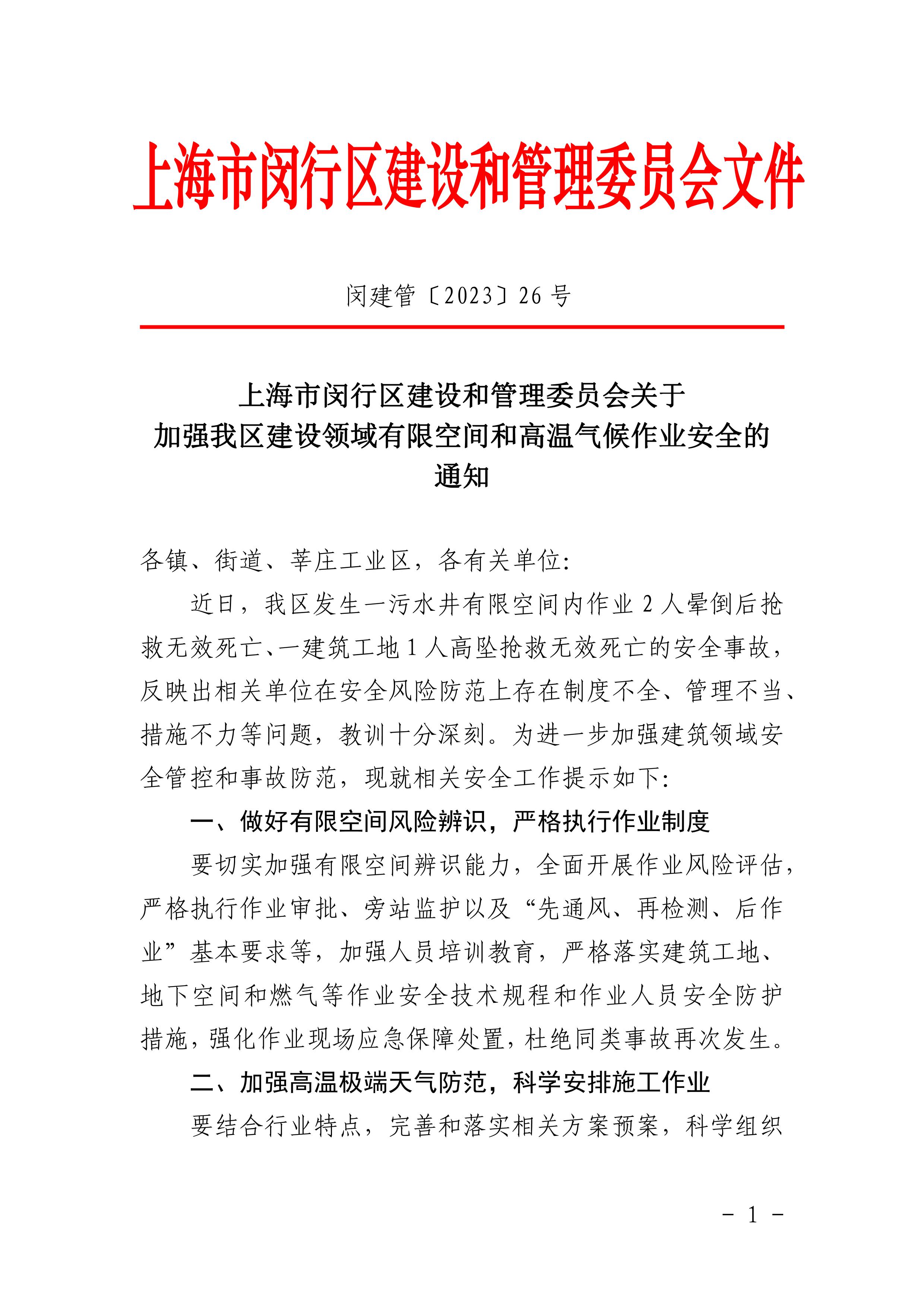 上海市闵行区建设和管理委员会关于 加强我区建设领域有限空间和高温气候作业安全的通知