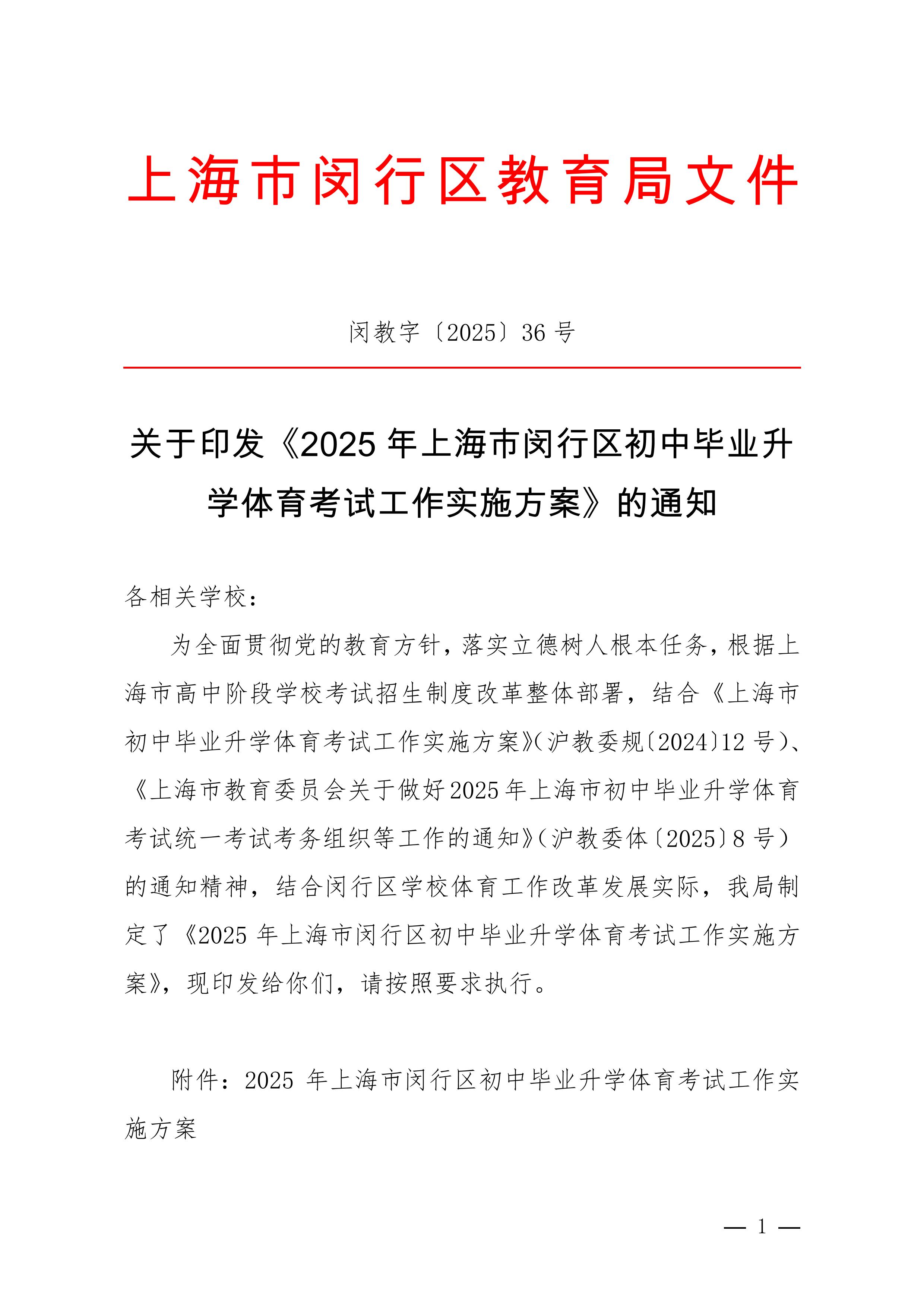 关于印发《2025年上海市闵行区初中毕业升学体育考试工作实施方案》的通知