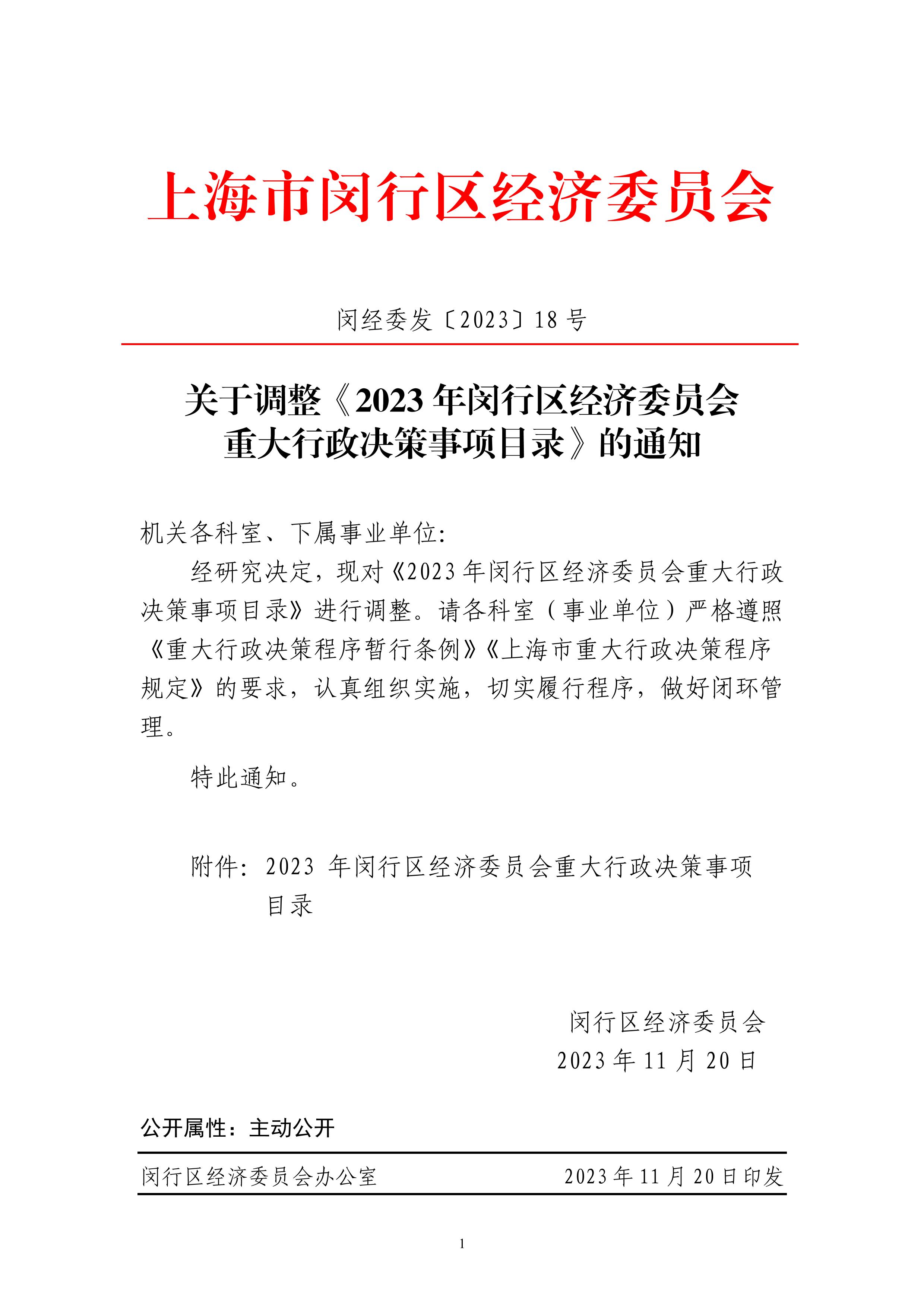 闵行区经济委员会关于调整《2023年闵行区经济委员会重大行政决策事项目录》的通知