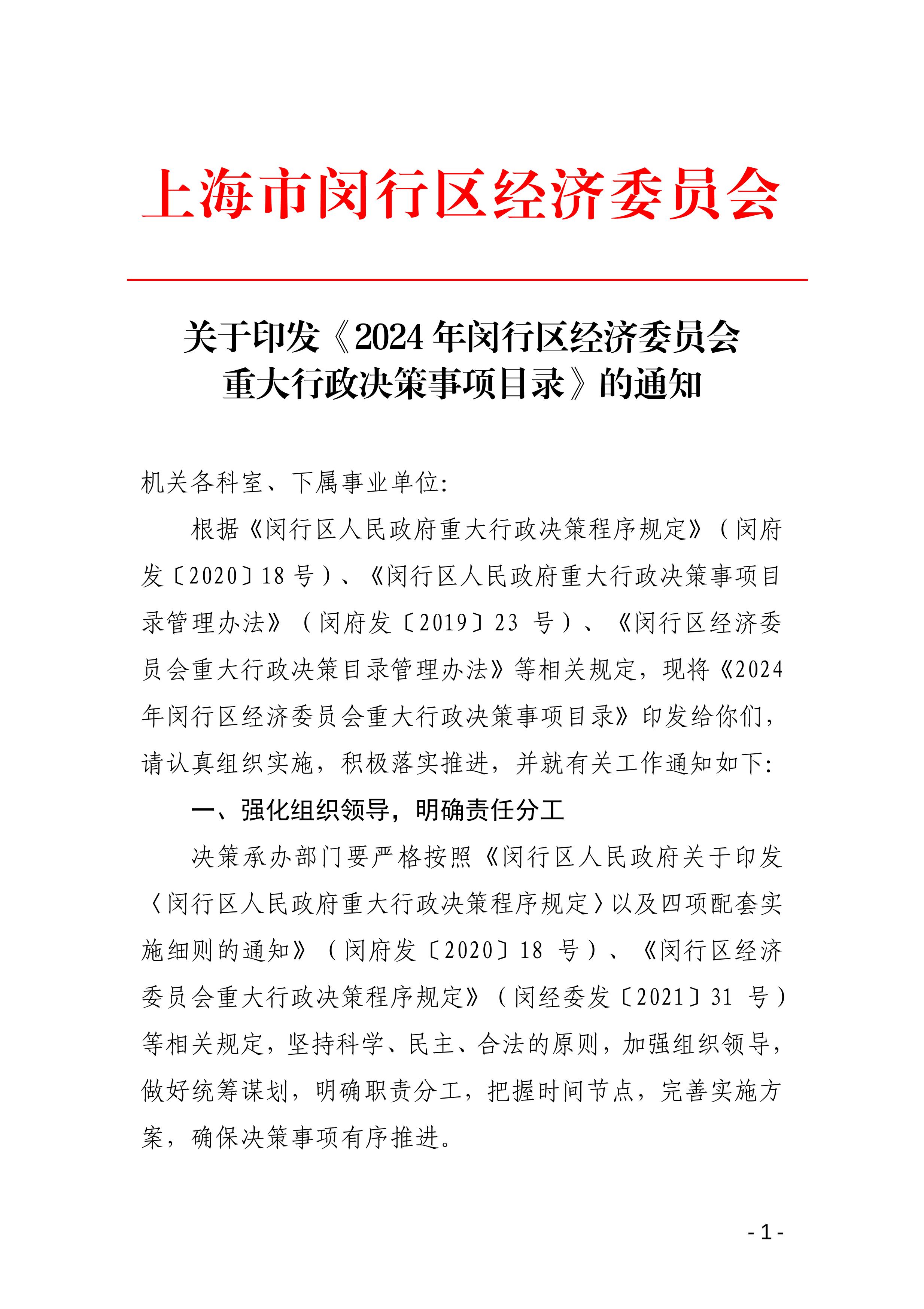 关于印发《2024年闵行区经济委员会重大行政决策事项目录》的通知