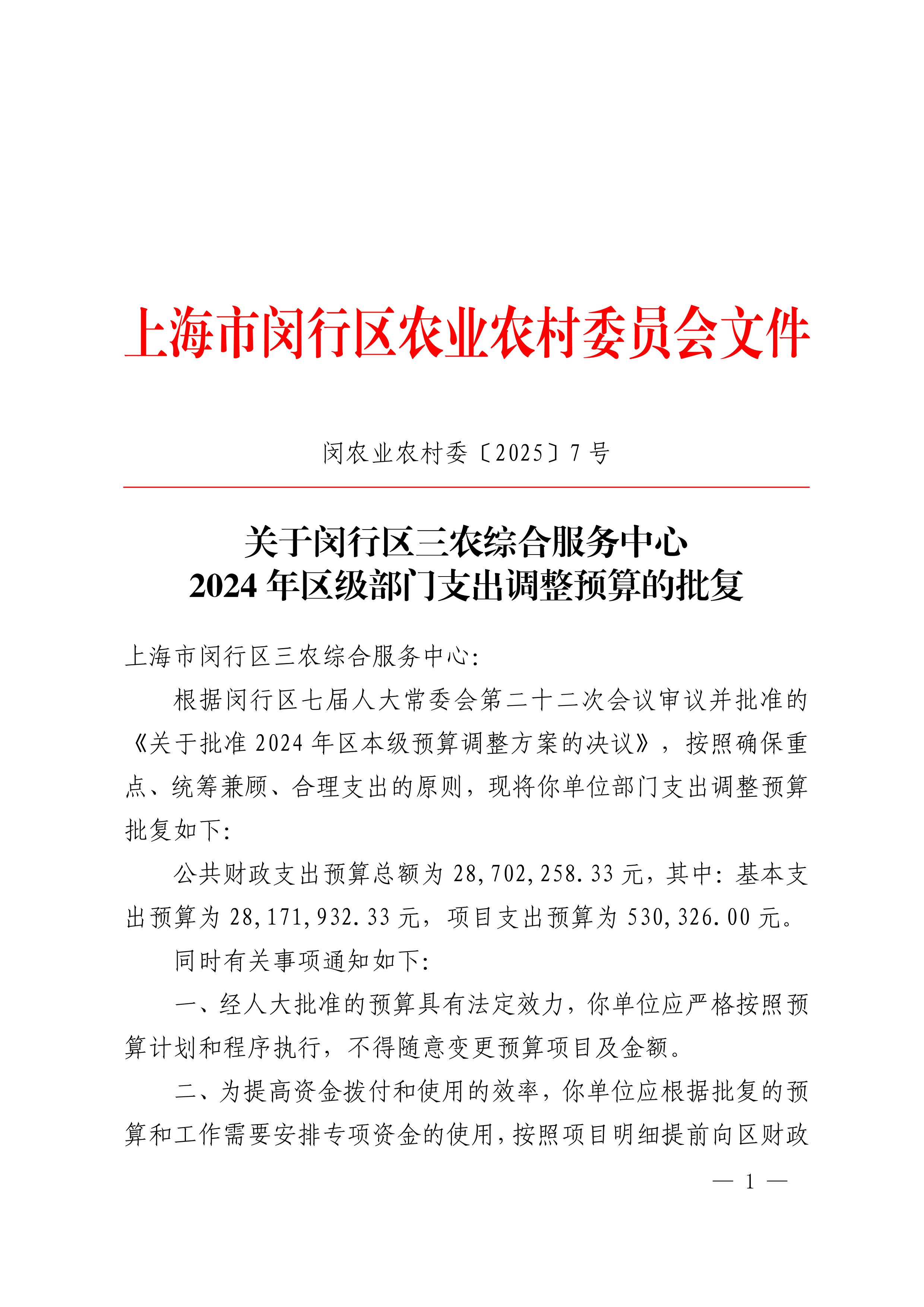 上海市闵行区三农综合服务中心: 根据闵行区七届人大常委会第二十二次会议审议并批准的《关于批准2024年区本级预算调整方案的决议》,按照确保重点、统筹兼顾、合理支出的原则,现将你单位部门支出调整预算批复如下: 公共财政支出预算总额为28,702,258.33元,其中:基本支出预算为28,171,932.33元,项目支出预算为530,326.00元。 同时有关事项通知如下: 一、经人大批准的预算具有法定效力,你单位应严格按照预算计划和程序执行,不得随意变更预算项目及金额。 二、为提高资金拨付和使用的效率,你单位应根据批复的预算和工作需要安排专项资金的使用,按照项目明细提前向区财政局申请用款,区财政局根据单位用款申请和项目进度拨付资金。 三、纳入政府采购管理范围的专项项目,必须按区政府规定的采购管理办法和程序进行采购。 特此批复。