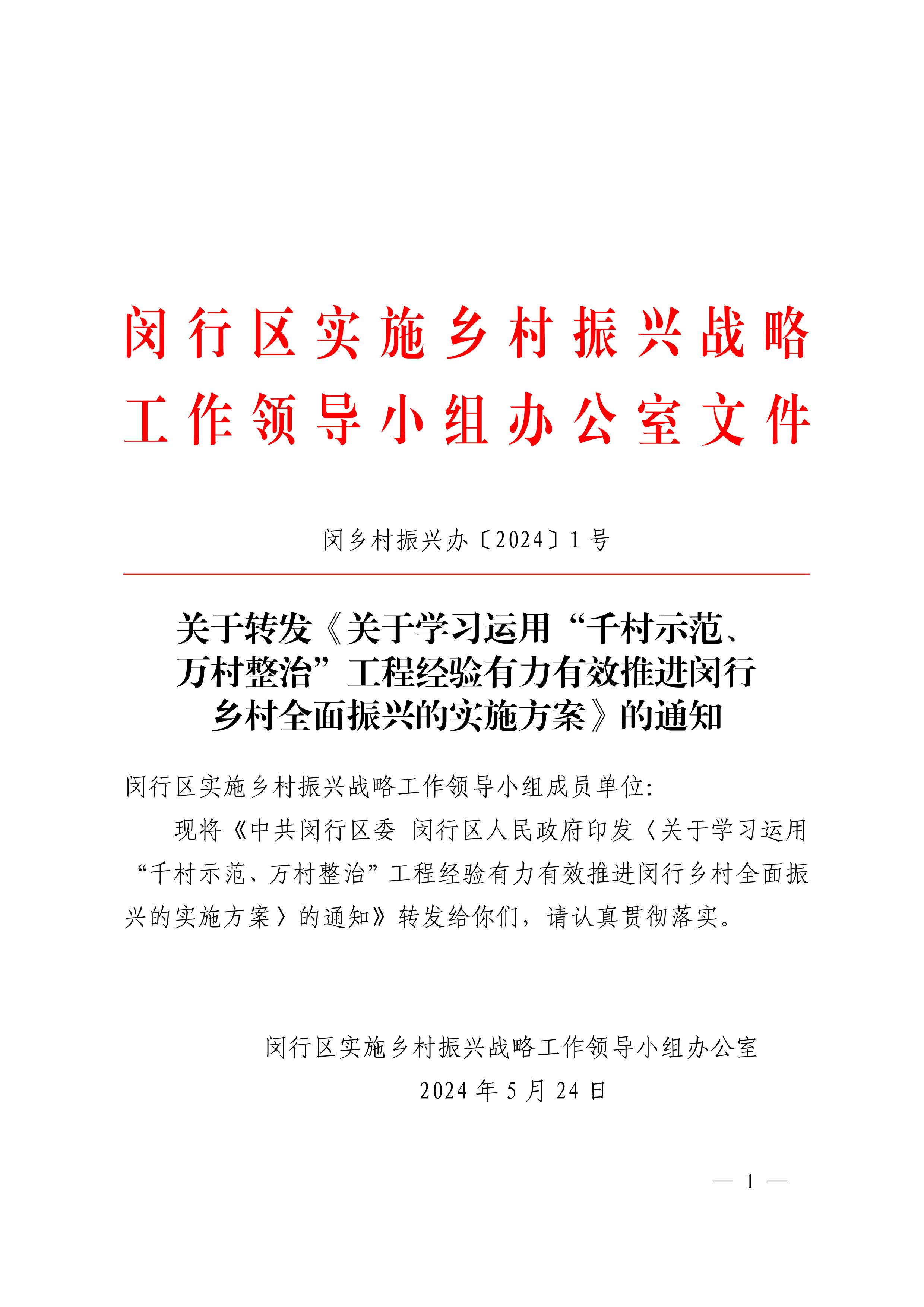 关于转发《关于学习运用“千村示范、万村整治”工程经验有力有效推进闵行乡村全面振兴的实施方案》的通知