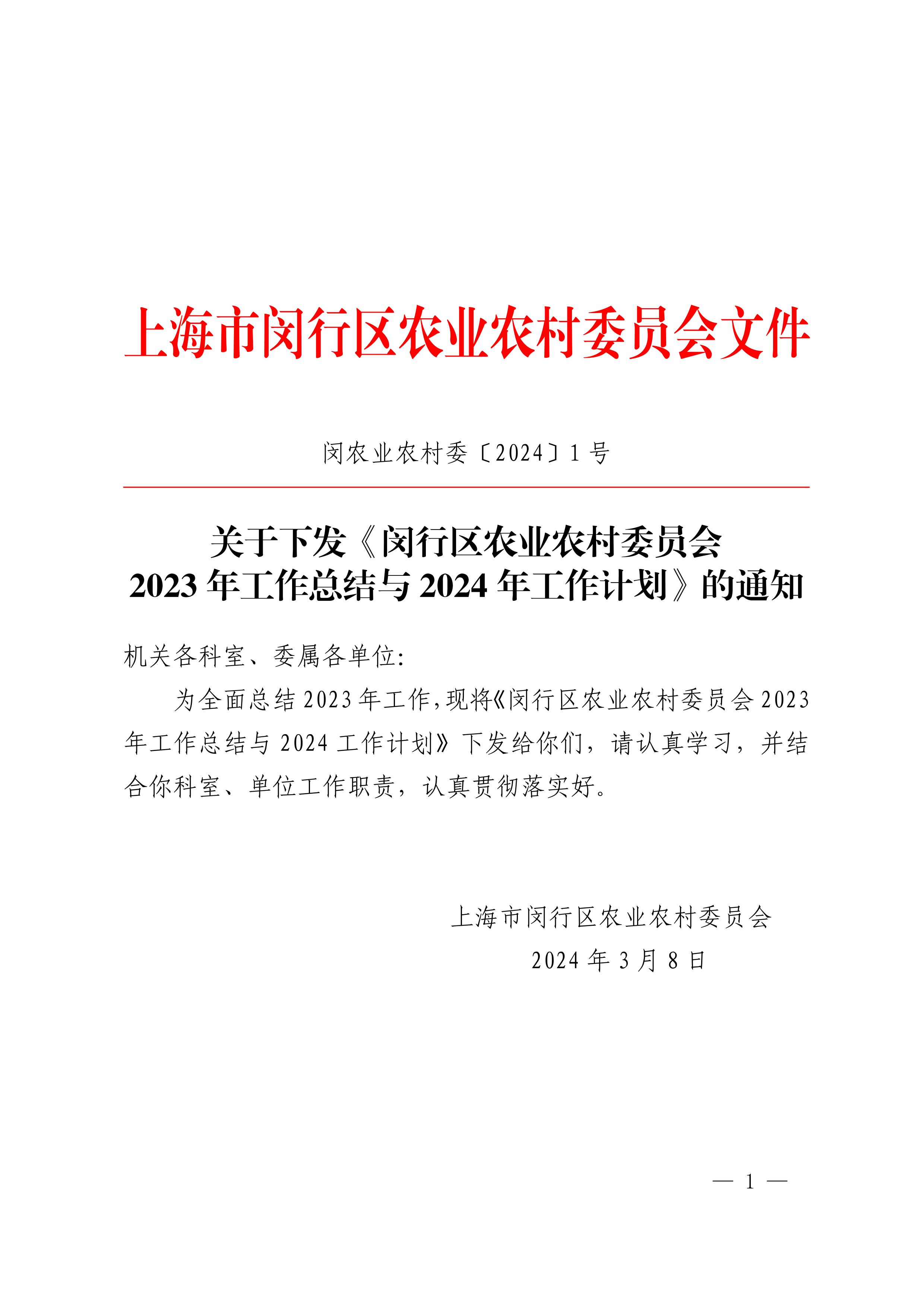 关于下发《闵行区农业农村委员会2023年工作总结与2024年工作计划》的通知