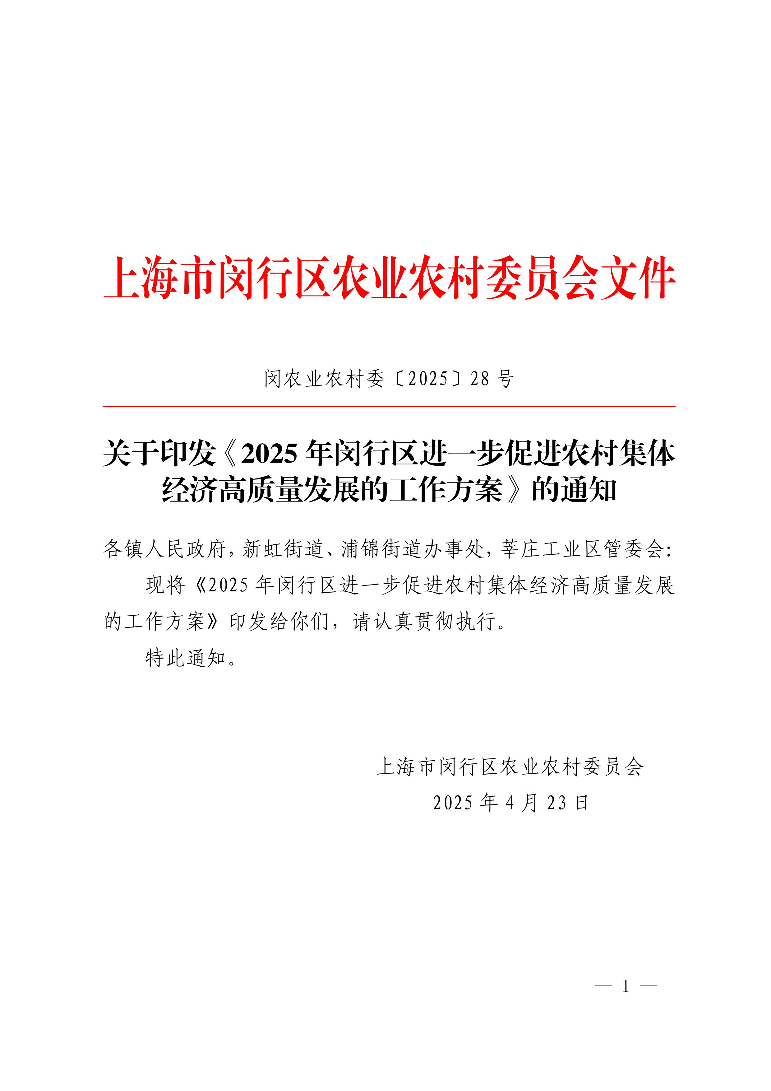 关于印发《2025年闵行区进一步促进农村集体经济高质量发展的工作方案》的通知
