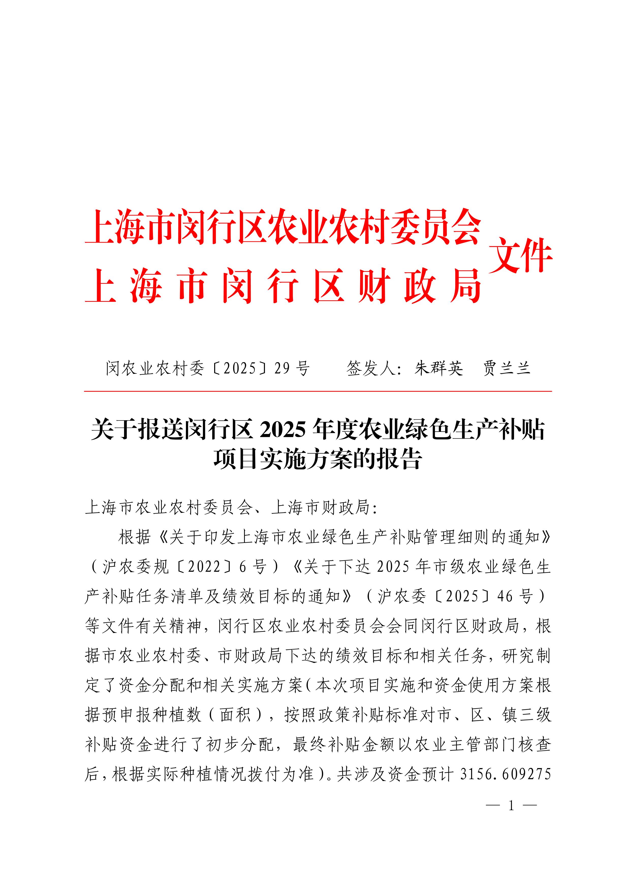 关于报送闵行区2025年度农业绿色生产补贴项目实施方案的报告