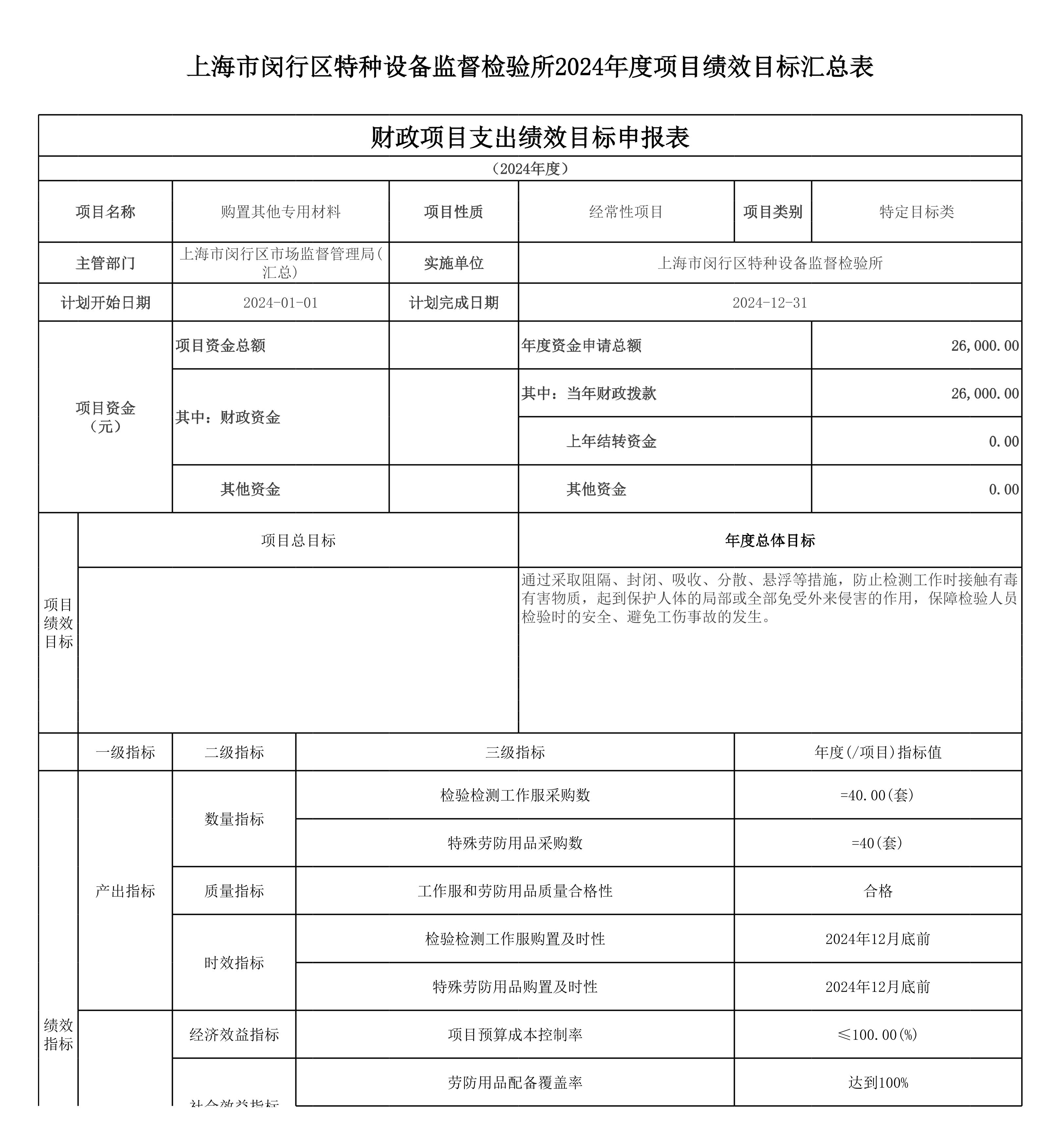 上海市闵行区特种设备监督检验所2024年度项目绩效目标汇总表