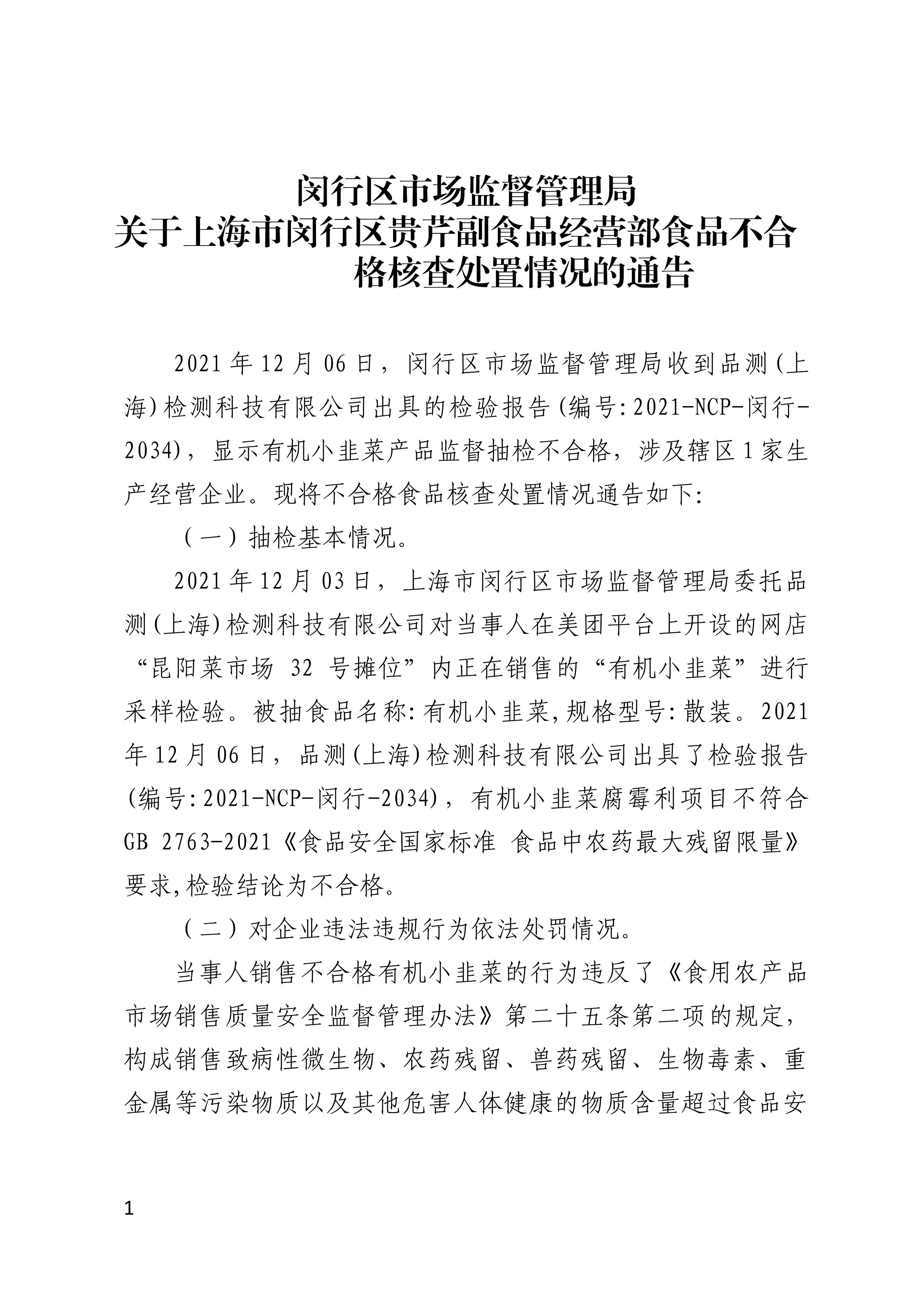 闵行区市场监督管理局关于不合格食品核查处置情况的通告