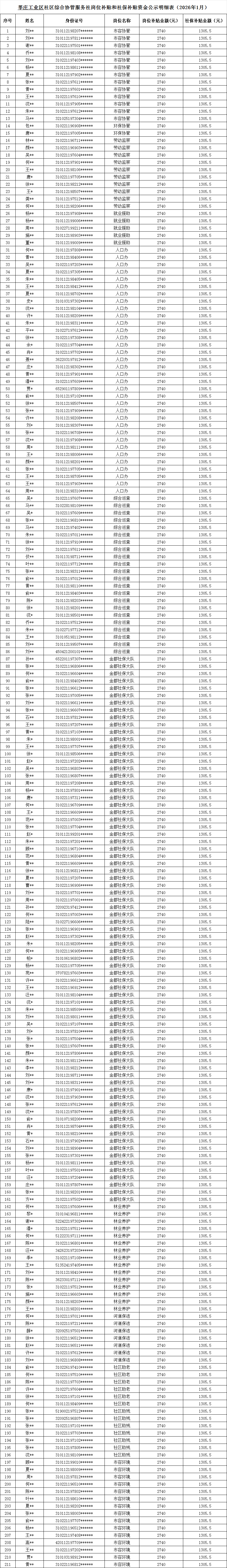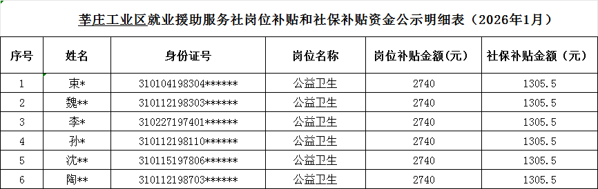 闵行区公益性转制队伍岗位补贴和社保补贴资金公示汇总表(2026年1月)