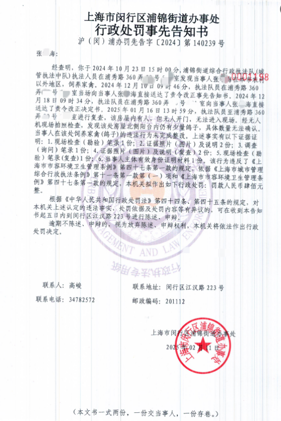 张学海: 2024年10月23日发现你在浦秀路360弄30号501室,在本市农村以外地区,饲养家禽(鸽子)一案,本机关于2025年2月11日作出《行政处罚事先告知书》。 因通过其他送达方式无法送达。现依据《中华人民共和国民事诉讼法》的规定,向你公告送达《行政处罚事先告知书》(文书编号:沪(闵)浦办罚先告字〔2024〕第140239号)。自发出公告之日起,经过三十日。即视为送达。 特此公告。 公告联系人:高峻、何叶捷 联系电话:34782572 附:行政处罚事先告知书(文书编号:沪(闵)浦办罚先告字〔2024〕第140239号) |