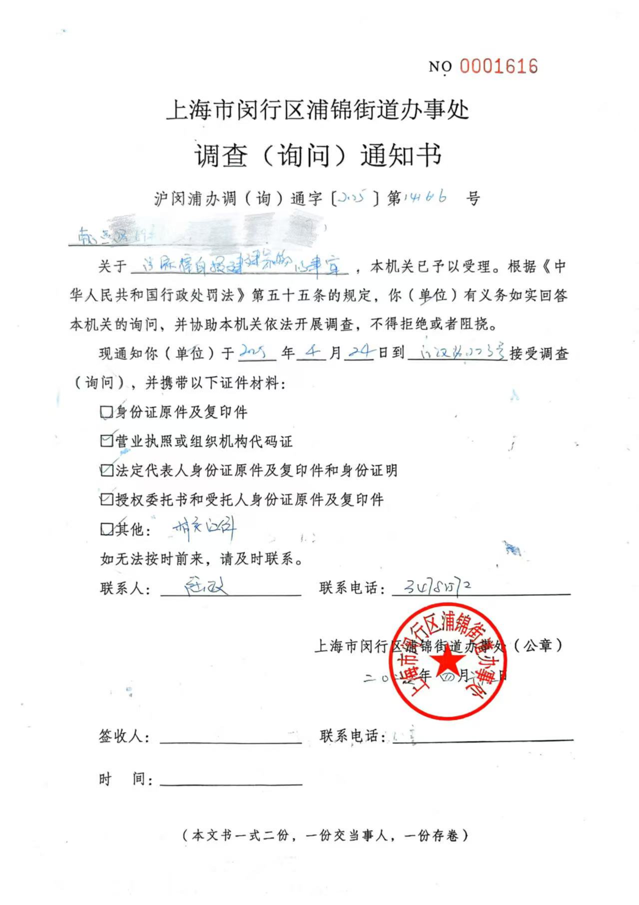 云灵凤: 2025年4月23日发现你在南江燕路69弄62号102室,涉嫌擅自搭建建筑物一案,本机关于2025年04月23日作出《调查(询问)通知书》。因通过其他送达方式无法送达。现依据《中华人民共和国民事诉讼法》的规定,向你公告送达《调查(询问)通知书》(文书编号:沪(闵)浦办调(询)通字〔2025〕第141616号)。自发出公告之日起,经过三十日,即视为送达。 特此公告。 公告联系人:舒康、仇亮 联系电话:34782572 附:《调查(询问)通知书》(沪闵浦调(询)通字〔2025〕第141616号) |
