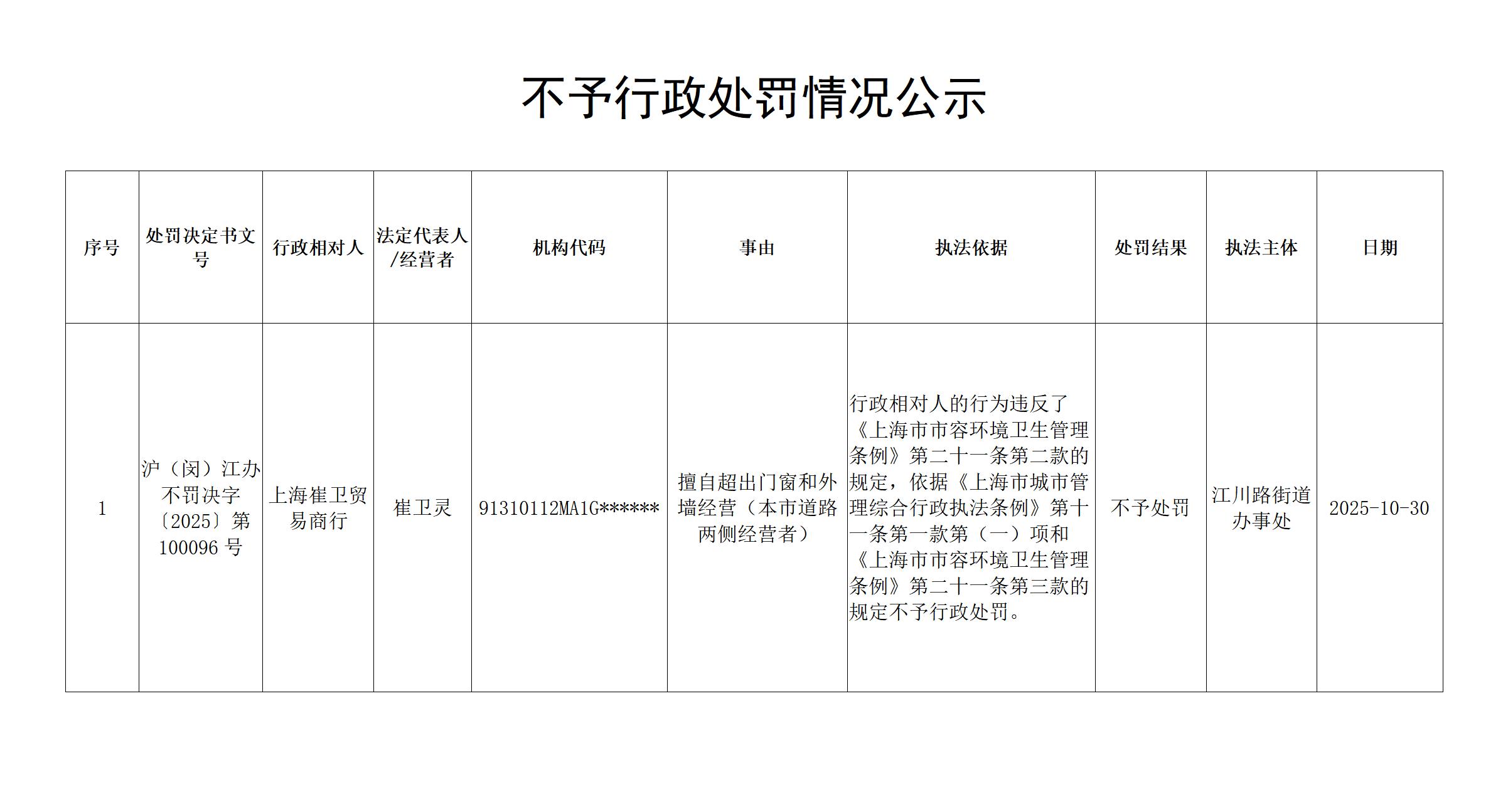 关于对行政相对人上海崔卫贸易商行不予行政处罚的情况公示