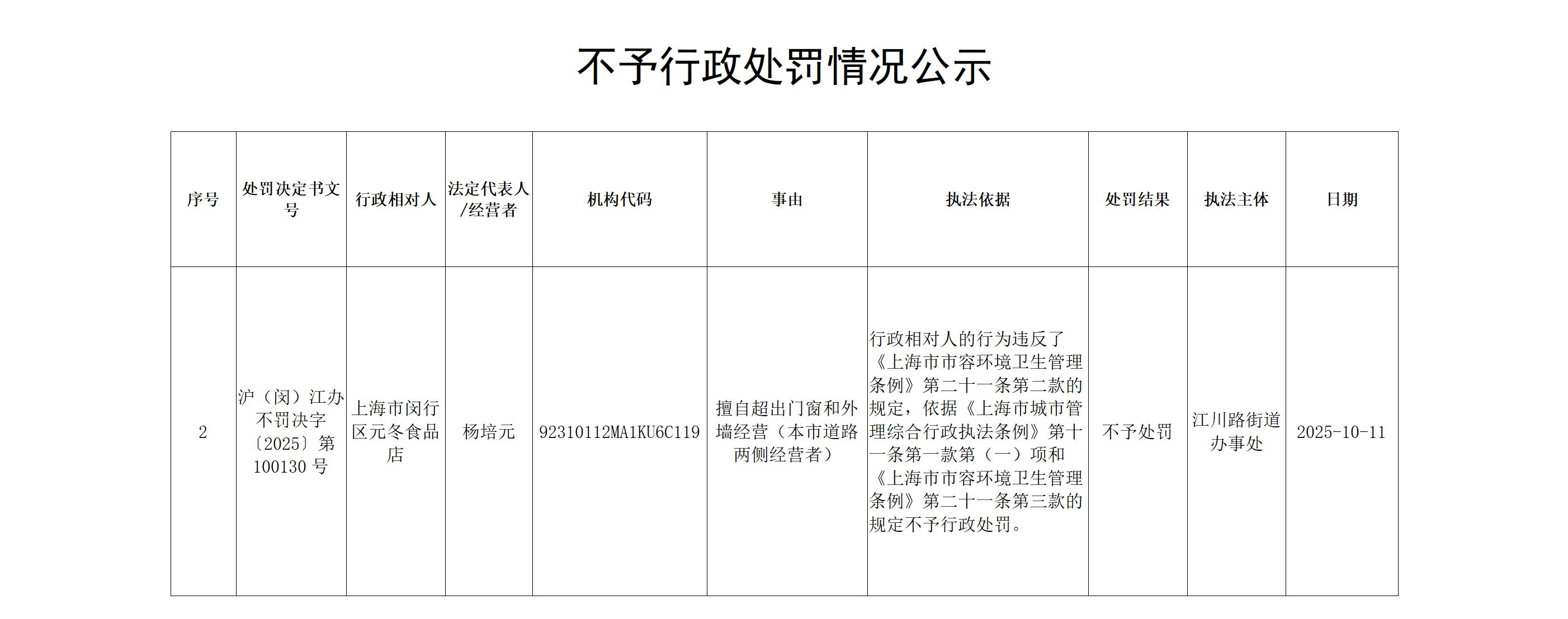 关于对行政相对人上海市闵行区元冬食品店不予行政处罚的情况公示.png