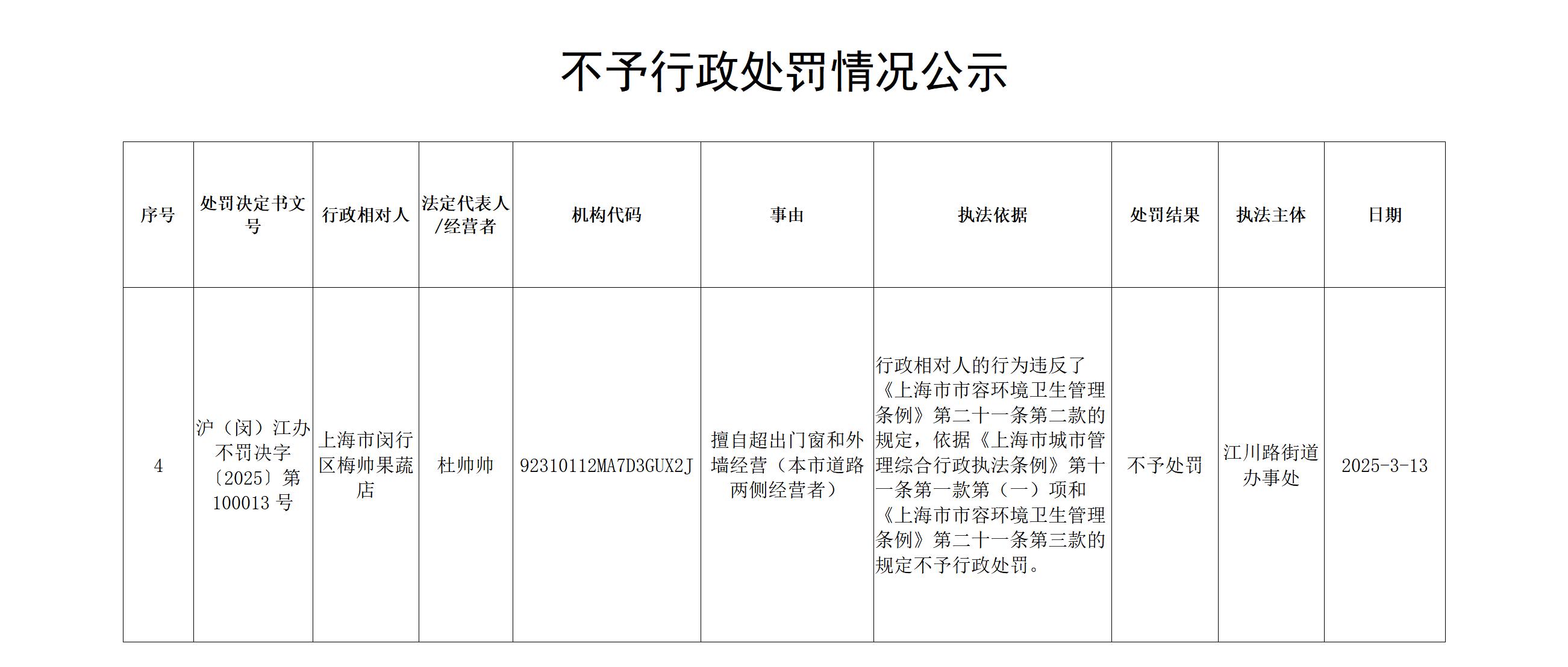 关于对行政相对人上海市闵行区梅帅果蔬店不予行政处罚的情况公示