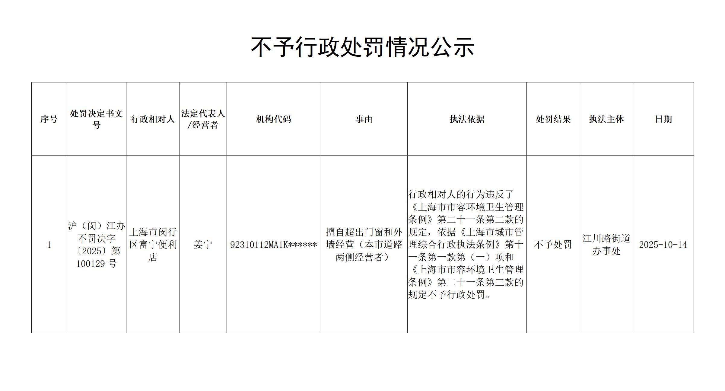 关于对行政相对人上海市闵行区富宁便利店不予行政处罚的情况公示