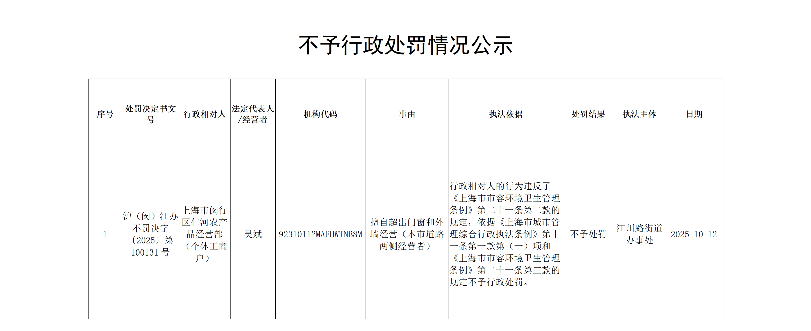 关于对行政相对人上海市闵行区仁河农产品经营部(个体工商户)不予行政处罚的情况公示