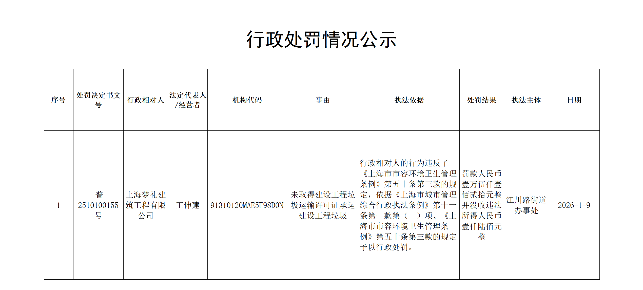 关于对行政相对人上海梦礼建筑工程有限公司行政处罚的情况公示