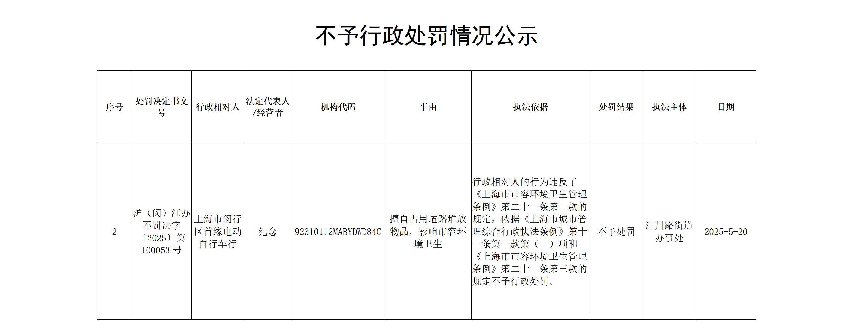关于对行政相对人上海市闵行区首缘电动自行车行不予行政处罚的情况公示