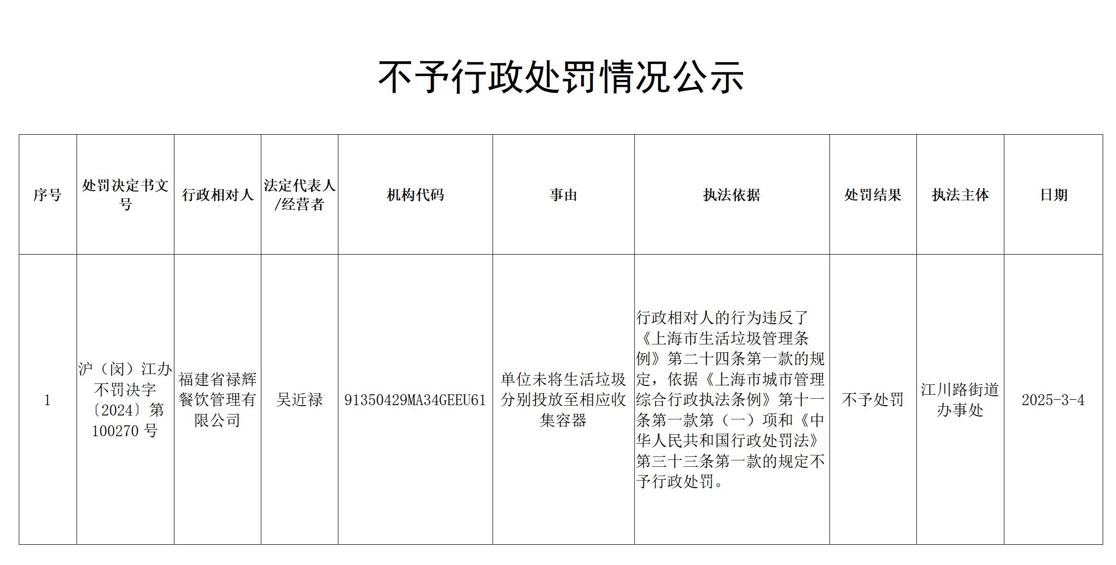 关于对行政相对人福建省禄辉餐饮管理有限公司不予行政处罚的情况公示