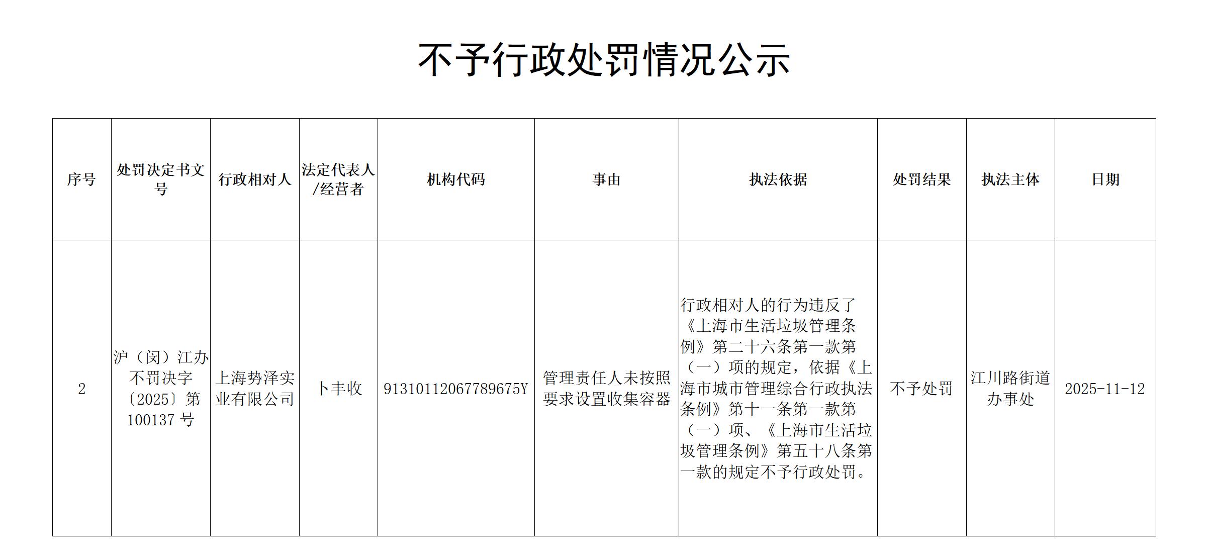 关于对行政相对人上海势泽实业有限公司不予行政处罚的情况公示