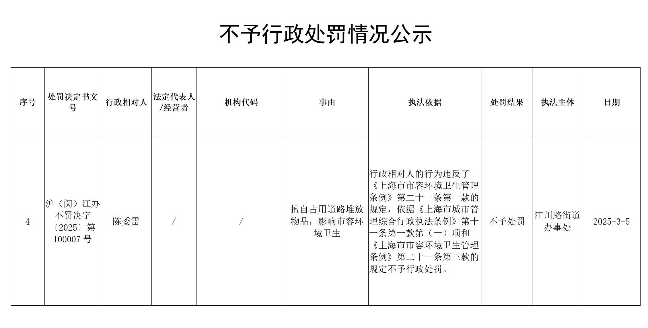关于对行政相对人陈委雷不予行政处罚的情况公示