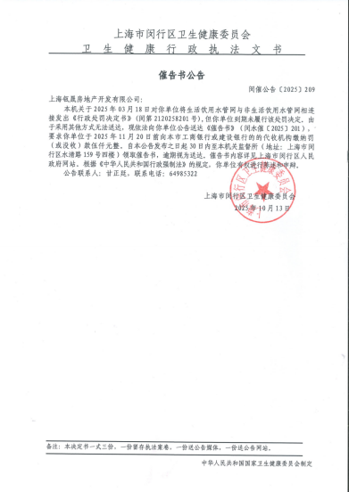 上海瓴晟房地产开发有限公司: 本机关于2025年03月18日对你单位将生活饮用水管网与非生活饮用水管网相连接发出《行政处罚决定书》(闵第2120258201号),但你单位到期未履行该处罚决定。由于采用其他方式无法送达,现依法向你单位公告送达《催告书》(闵水催〔2025〕201),要求你单位于2025年11月20日前向本市工商银行或建设银行的的代收机构缴纳罚(或没收)款伍仟元整。自本公告发布之日起30日内至本机关监督所(地址:上海市闵行区水清路159号四楼)领取催告书,逾期视为送达。催告书内容详见上海市闵行区人民政府网站。根据《中华人民共和国行政强制法》的规定,你单位有权进行陈述和申辩。 公告联系人:甘正廷,联系电话:64985322