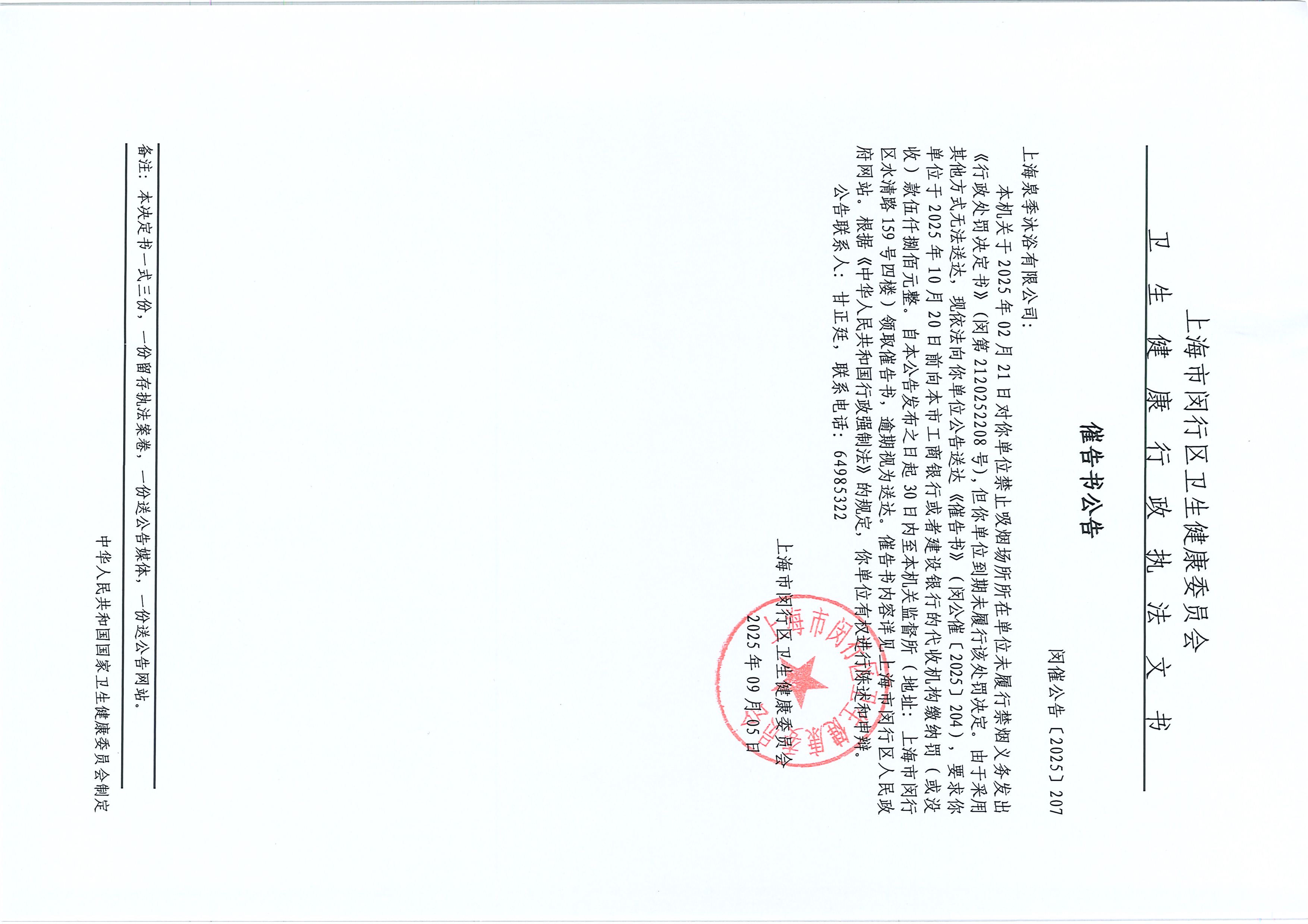 催告书公告 闵催公告〔2025〕207 上海泉季沐浴有限公司: 本机关于2025年02月21日对你单位禁止吸烟场所所在单位未履行禁烟义务发出《行政处罚决定书》(闵第2120252208号),但你单位到期未履行该处罚决定。由于采用其他方式无法送达,现依法向你单位公告送达《催告书》(闵公催〔2025〕204),要求你单位于2025年10月20日前向本市工商银行或者建设银行的代收机构缴纳罚(或没收)款伍仟捌佰元整。自本公告发布之日起30日内至本机关监督所(地址:上海市闵行区水清路159号四楼)领取催告书,逾期视为送达。催告书内容详见上海市闵行区人民政府网站。根据《中华人民共和国行政强制法》的规定,你单位有权进行陈述和申辩。 公告联系人:甘正廷,联系电话:64985322