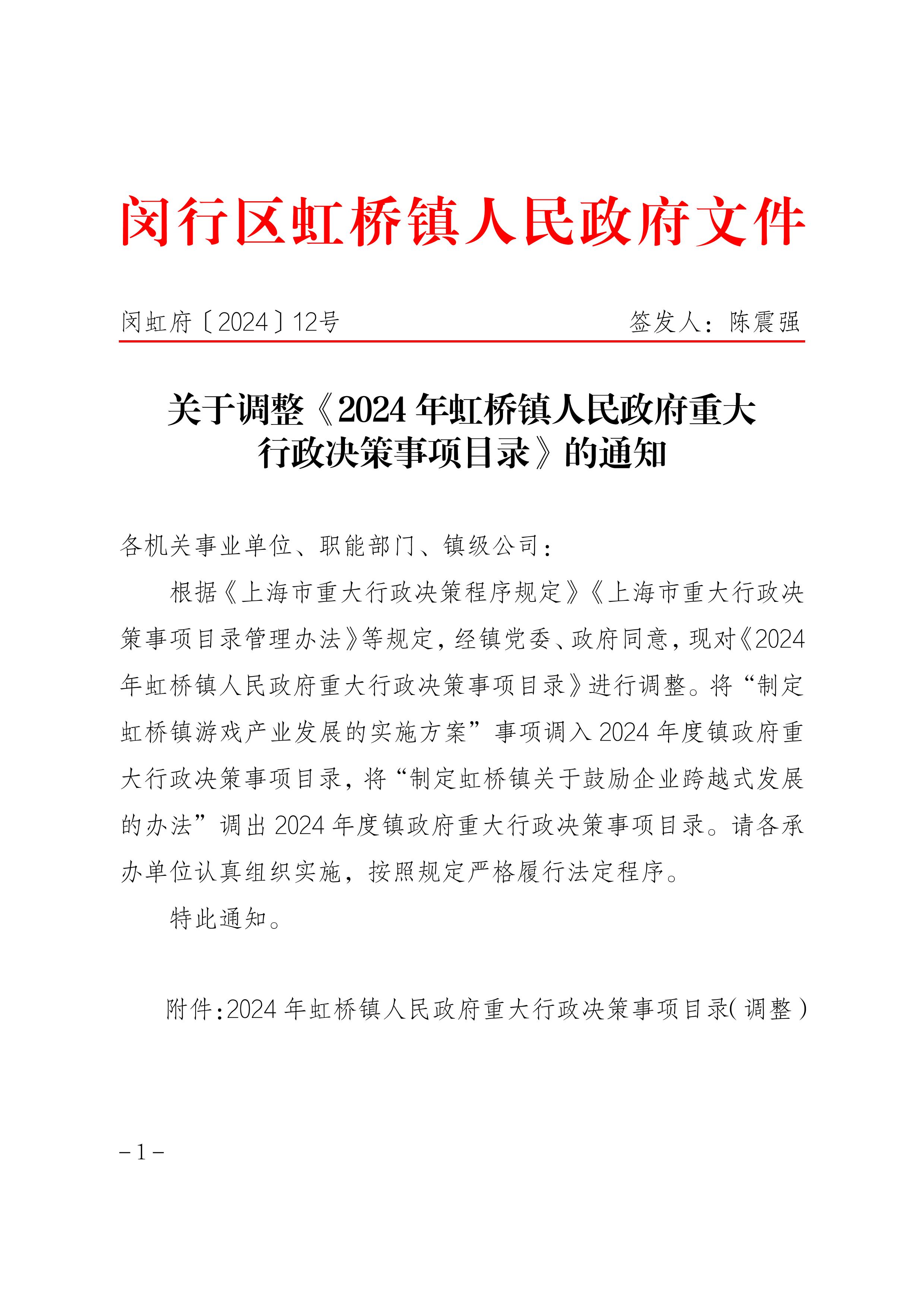 关于调整《2024年虹桥镇人民政府重大行政决策事项目录》的通知