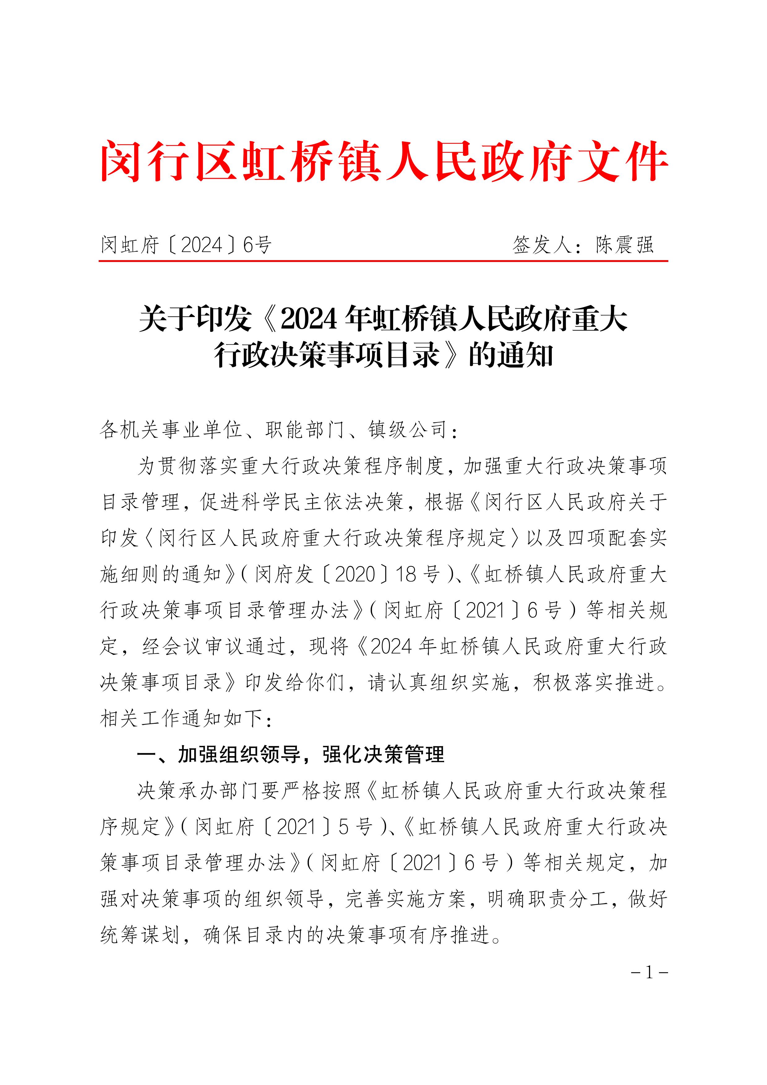 关于印发《2024年虹桥镇人民政府重大行政决策事项目录》的通知