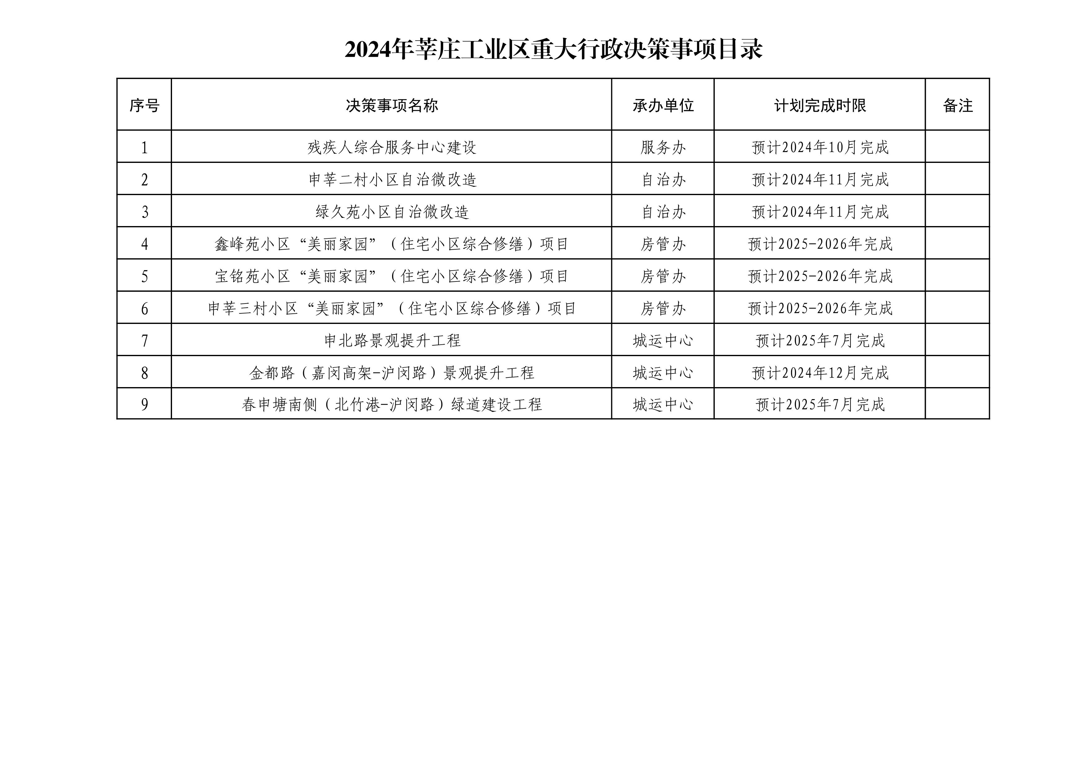 2024年莘庄工业区管委会重大行政决策年度事项目录