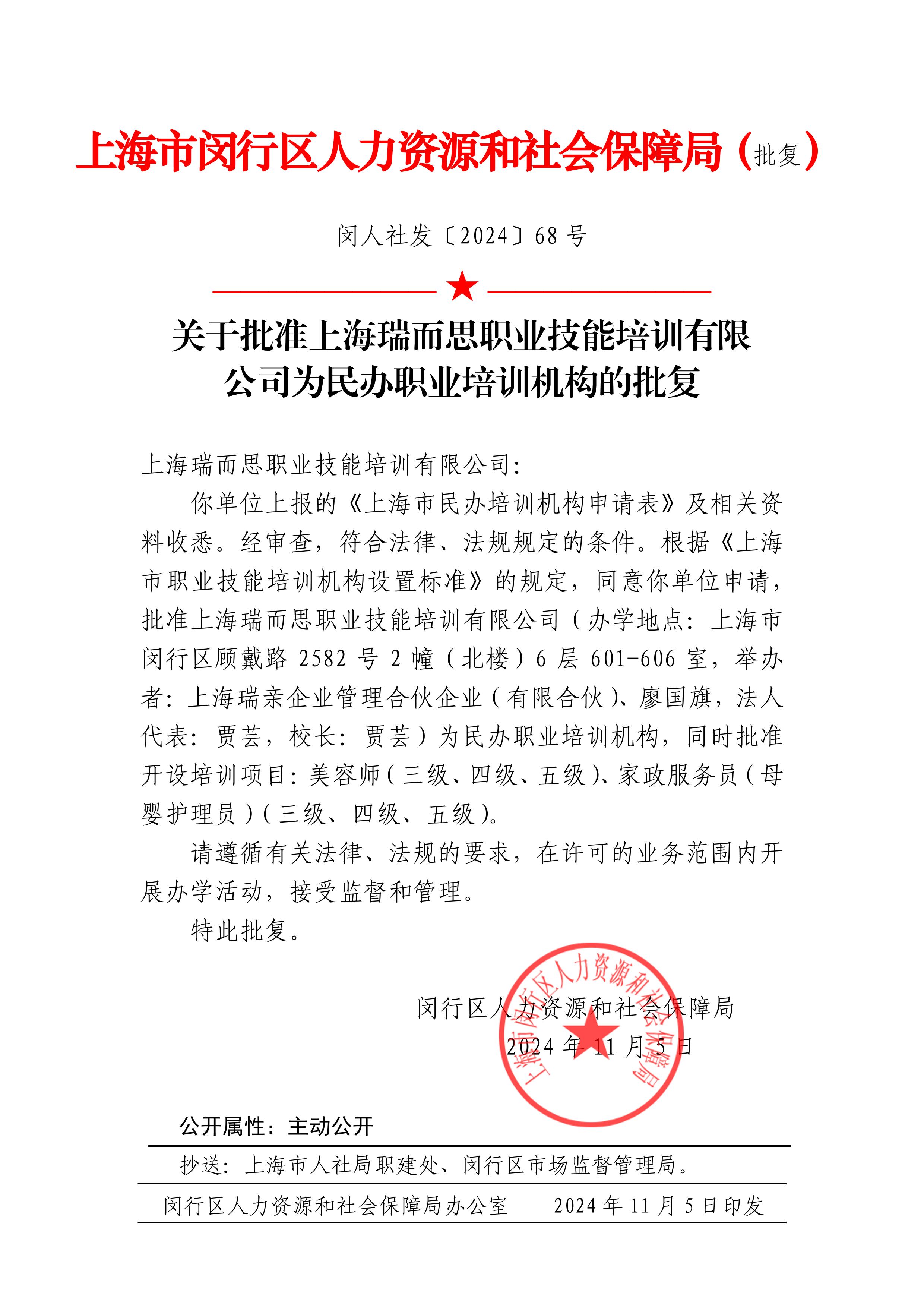上海瑞而思职业技能培训有限公司: 你单位上报的《上海市民办培训机构申请表》及相关资料收悉。经审查,符合法律、法规规定的条件。根据《上海市职业技能培训机构设置标准》的规定,同意你单位申请,批准上海瑞而思职业技能培训有限公司(办学地点:上海市闵行区顾戴路2582号2幢(北楼)6层601-606室,举办者:上海瑞亲企业管理合伙企业(有限合伙)、廖国旗,法人代表:贾芸,校长:贾芸)为民办职业培训机构,同时批准开设培训项目:美容师(三级、四级、五级)、家政服务员(母婴护理员)(三级、四级、五级)。 请遵循有关法律、法规的要求,在许可的业务范围内开展办学活动,接受监督和管理。 特此批复。