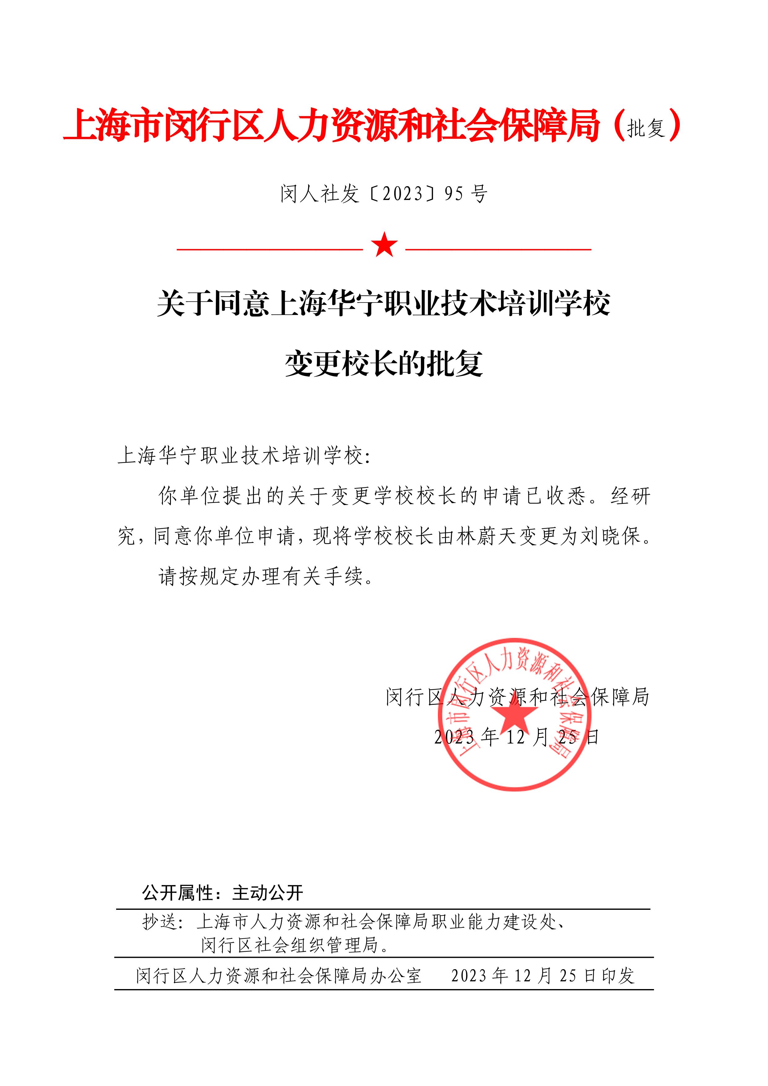 上海华宁职业技术培训学校: 你单位提出的关于变更学校校长的申请已收悉。经研究,同意你单位申请,现将学校校长由林蔚天变更为刘晓保。 请按规定办理有关手续。