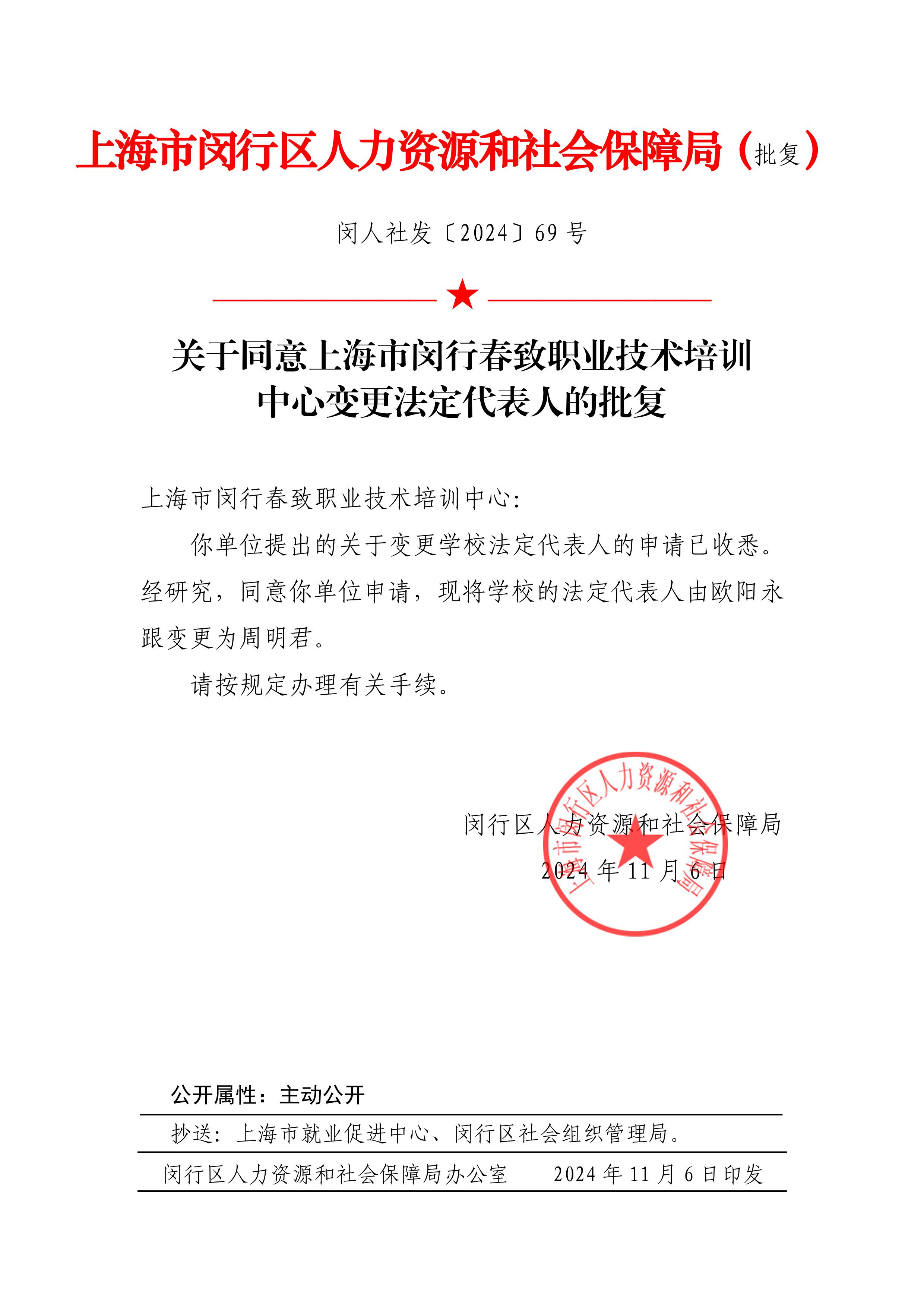 关于同意上海市闵行春致职业技术培训中心变更法定代表人的批复