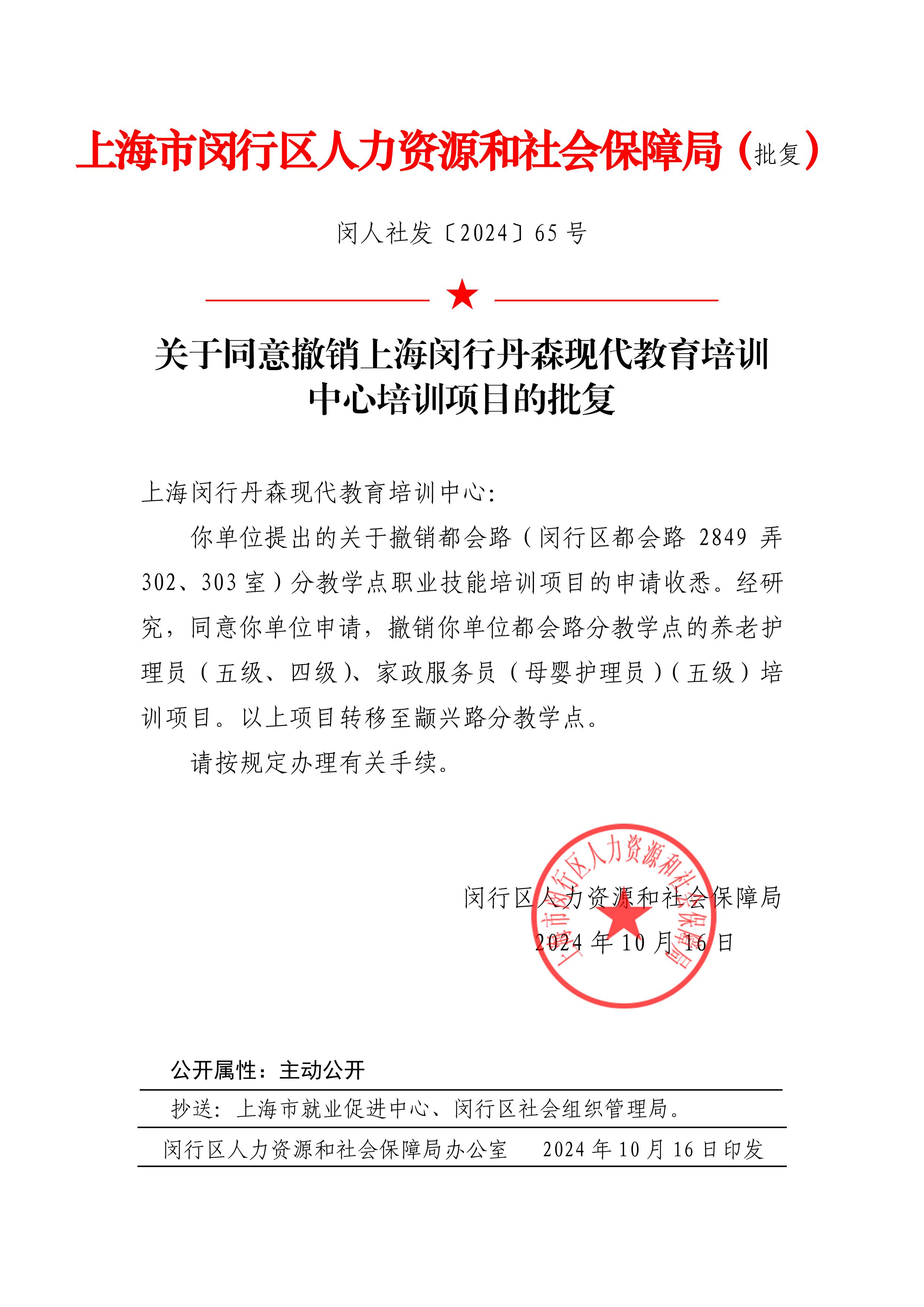 上海闵行丹森现代教育培训中心: 你单位提出的关于撤销都会路(闵行区都会路2849弄302、303室)分教学点职业技能培训项目的申请收悉。经研究,同意你单位申请,撤销你单位都会路分教学点的养老护理员(五级、四级)、家政服务员(母婴护理员)(五级)培训项目。以上项目转移至颛兴路分教学点。 请按规定办理有关手续。